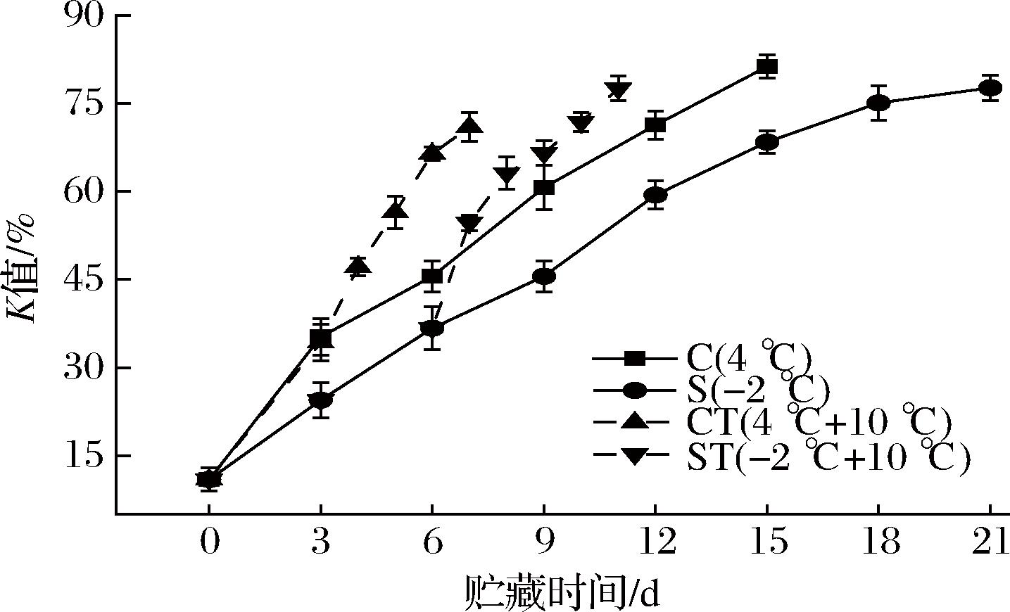 K值是ATP的降解产物HxR、Hx的量之和与ATP关联化合物——ATP、ADP、AMP、IMP、HxR、Hx的总量的百分比,它是评价水产品新鲜度的一种指标。一般认为,K值<10%为新鲜水产品,K值>70%为腐败水产品[27]。乌鳢鱼肉在冷却与微冻贮藏期间的K值变化如图8所示,随着贮藏时间的变化呈上升趋势。微冻贮藏的S组的上升趋势相较于冷却贮藏的C组更加平缓一些,C组在第12天K值就达到了71.28%,超过了可食用的限制,而S组在第18天的K值为75.06%,延长了6 d时间。这表明微冻贮藏能够抑制ATP酶等内源酶的活性,减缓了ATP及其降解产物的分解进程。经过冷却与微冻贮藏后置于10 ℃的乌鳢鱼肉K值如图8所示。在初始K值相似的情况下,经过微冻贮藏的ST组的K值增长速率高于经过冷却贮藏的CT组,但在贮藏末期其K值趋于相等,几乎同时超过70%,这可能是因为微冻导致的冰晶生成所造成的机械损伤使得肌质网中的Ca2+被加速释放,将肌球蛋白头部带有的ATP酶激活,加速分解ATP,以至于K值快速增加。