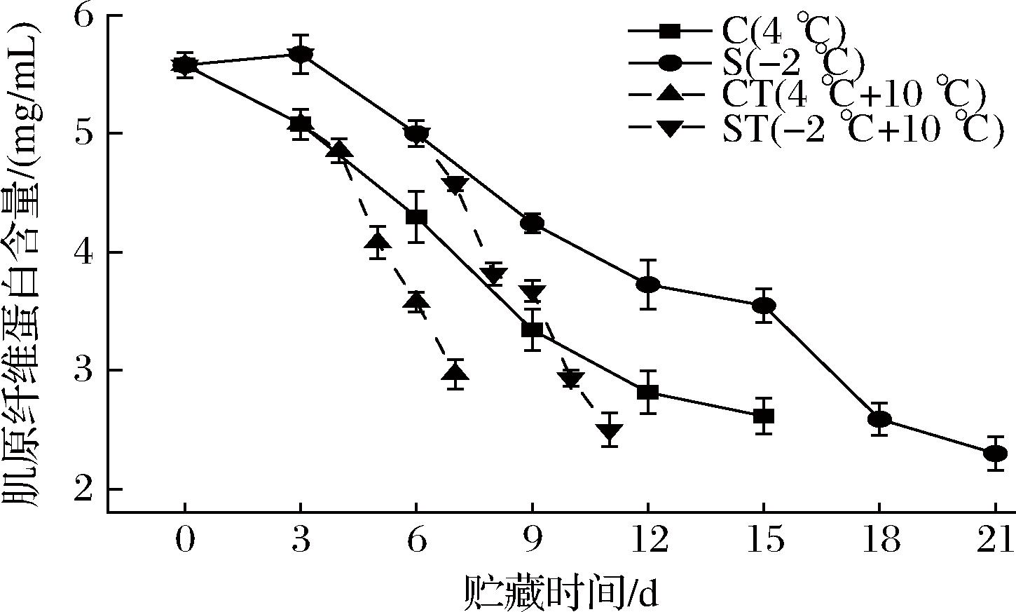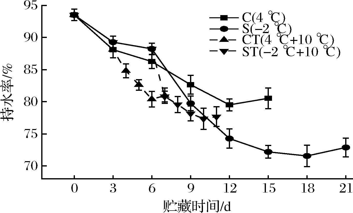WHC是肌肉的持水能力,表现为肌肉受到外力的作用时,保持原本水分的能力[21],它是判断鱼肉品质的一个重要参数。如图6所示,随着贮藏时间的延长,各组持水性呈下降趋势。贮藏末期,C组和S组的持水性分别比初期下降了13.88%、22.06%。在0~6 d时,微冻贮藏的S组的持水性比冷却贮藏的C组高,而6 d后,S组持水性迅速下降,这是可能因为在微冻过程前期,鱼肉部分冻结,但冰晶生成较少,蛋白降解和膜结构的破坏较小,因此下降较为缓慢,而冷却贮藏的鱼肉在僵硬和解僵过程中,肌原纤维收缩,使得其内部的水分逐渐被挤压到外面,造成鱼肉的持水力下降[22]。一段时间后,微冻组由于贮藏时不可避免的温度波动,导致冰晶反复冻融,生成重结晶,冰晶的增加破坏了细胞结构,造成其机械损伤,蛋白质高分子网状立体结构被破坏,导致汁液流失,持水能力下降[23]。ST组在微冻到第6天置于10 ℃后,持水性较CT组显著下降,可能是因为微冻时部分水结冰,酶的浓度增加,剩余水中的盐浓度增加,导致蛋白质变性[24],置于10 ℃后,冰晶造成的机械损伤相较于CT组更多,因此持水性下降更快。在贮藏末期,各组持水性均略有上升,这是因为蛋白质的降解产物带来更多的静电荷,使肌纤维重新将滞留在细胞膜和肌束膜之间的水分重新吸收,因此会获得较好的持水性[25]。