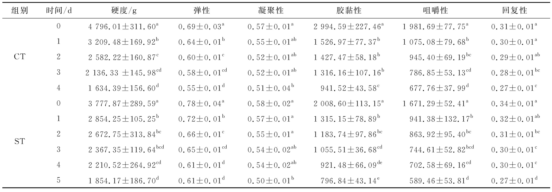 组别时间/d硬度/g弹性凝聚性胶黏性咀嚼性回复性CT04 796.01±311.60a0.69±0.03a0.57±0.01a2 994.59±227.46a1 981.69±77.75a0.31±0.01a13 209.48±169.92b0.64±0.01b0.55±0.01ab1 526.97±77.37b1 075.08±79.68b0.30±0.01a22 582.22±160.87c0.60±0.01c0.52±0.01ab1 427.47±58.18b945.40±69.19bc0.29±0.01ab32 136.33 ±145.98cd0.58±0.01cd0.52±0.01ab1 316.16±107.16b786.85±53.13cd0.28±0.01bc41 634.39±156.60d0.55±0.01d0.51±0.04b941.52±43.58c677.76±37.99d0.27±0.01cST03 777.87±289.59a0.78±0.04a0.58±0.02a2 008.60±113.15a1 671.29±52.41a0.34±0.01a12 854.25±105.25b0.72±0.01b0.57±0.01a1 315.15±78.89b941.38±132.17b0.32±0.01ab22 672.75±313.84bc0.66±0.01c0.55±0.01a1 183.74±97.86bc863.92±95.40bc0.31±0.01bc32 367.35±119.64bcd0.65±0.01cd0.54±0.02ab1 055.51±36.68cd744.61±52.82bcd0.30±0.01c42 210.52±264.92cd0.61±0.01d0.54±0.02ab921.48±66.09de702.58±69.16cd0.30±0.01c51 854.17±186.70d0.61±0.01d0.50±0.01b796.84±43.14e589.46±53.81d0.27±0.01d