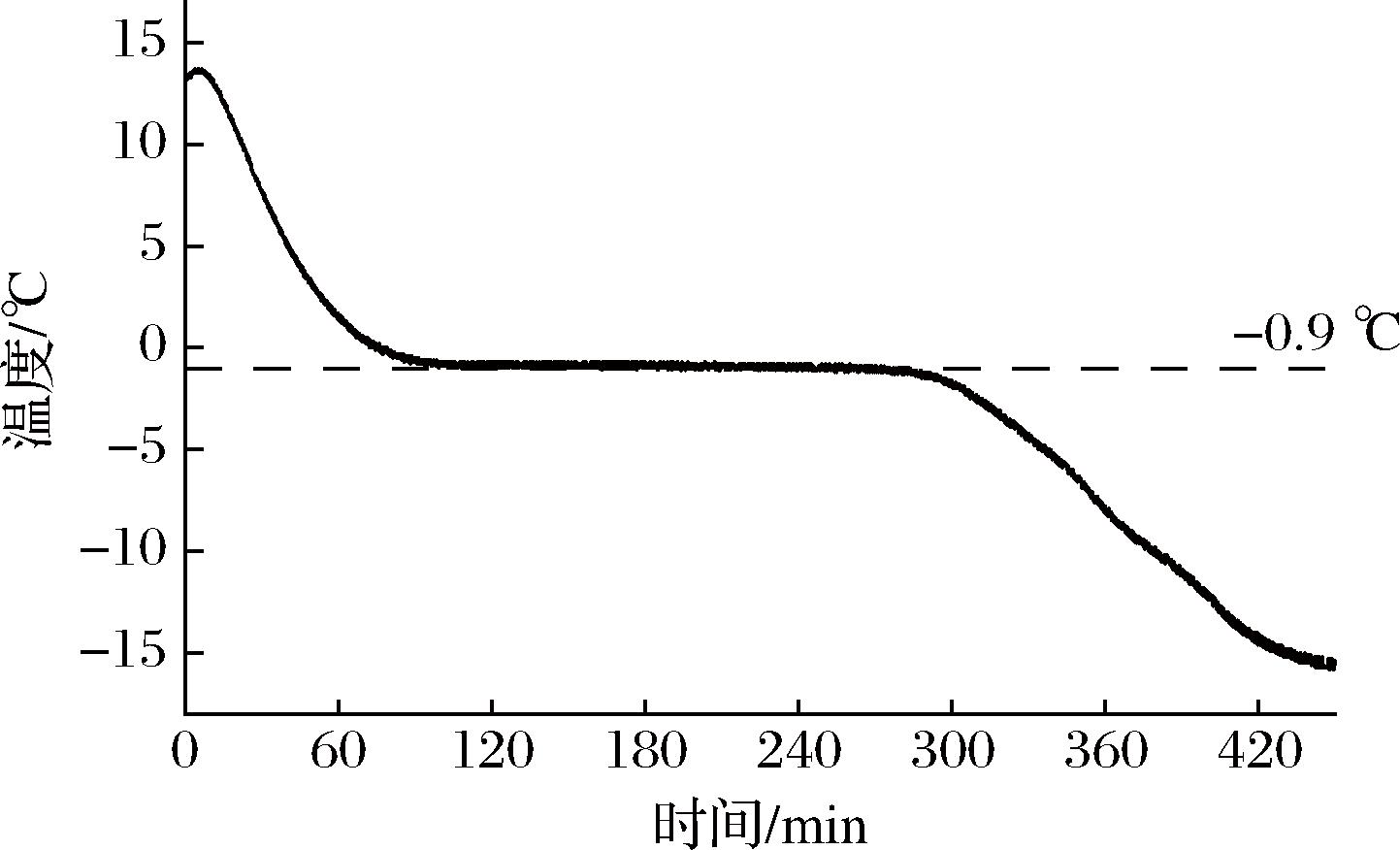 参照郑稳等[6]的方法,稍加改动,使用温度记录仪,连接电脑,设置记录时间间隔为10 s,持续时间8 h。将探头插入乌鳢背部肌肉中,确保鱼肉与探头紧密贴合、无空隙后,将乌鳢放入-18 ℃冰箱中冷冻,结束后将数据导入电脑,绘制乌鳢肌肉温度随时间变化的曲线,分析可得其冻结点。