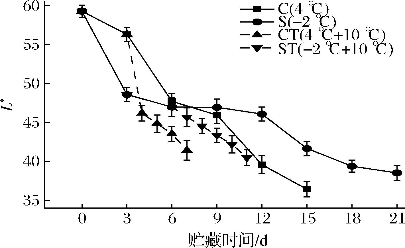 色泽的变化可以直观反映鱼肉劣变,是评价水产品品质的重要指标,它与蛋白质变性和降解、水分流失、脂肪氧化与微生物作用等有关[29]。新鲜的乌鳢被宰杀后,随着贮藏时间的延长会逐渐变为褐色。如图9所示,总体上来看,随着贮藏时间的延长,各组L*值呈下降趋势,C组与S组显著下降(P<0.05),在第15天时,C组与S组分别下降了38.59%、29.76%,CT组与ST组在置于10 ℃后L*值显著下降(P<0.05),在第4天时,分别下降了30.02%、10.22%,其值分别为41.40、42.17。S组变暗的速度低于C组,可能是因为鱼肉中的脂肪和一些营养成分发生氧化,氧化产物的积累使鱼肉的颜色变得暗淡,通过上文TBA的测定,微冻贮藏的乌鳢脂肪氧化的速度较慢,因此亮度变化较小,而置于10 ℃后,CT组的亮度迅速变小,在贮藏末期与ST组相近,也与TBA的结果相似。