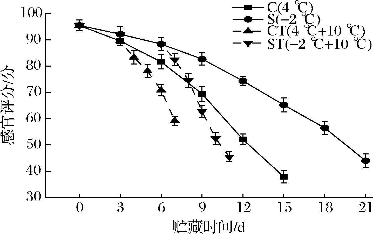 CT组与ST组鱼肉分别于第3天、第6天置于10 ℃后,感官评分相较于C组与S组显著下降(P<0.05),并分别于置于10 ℃后的第4天降至59.2±1.7、52.5±2.3,处于感官不可接受状态。置于10 ℃后,由于周围温度的升高,CT组与ST组腐坏的速度加快,ST组感官评分下降速率较之CT组高18.25%,这可能因为在前6天的微冻过程中,鱼肉在冻结点附近反复冻融,导致鱼肉内部组织损伤,因此在10 ℃下解冻后,ST组鱼肉的感官评分下降较快。