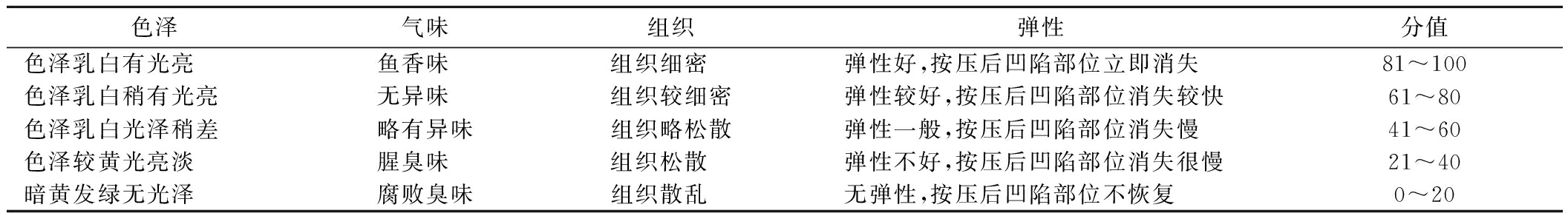 色泽气味组织弹性分值色泽乳白有光亮鱼香味 组织细密 弹性好,按压后凹陷部位立即消失81~100色泽乳白稍有光亮无异味 组织较细密弹性较好,按压后凹陷部位消失较快61~80色泽乳白光泽稍差略有异味组织略松散弹性一般,按压后凹陷部位消失慢41~60色泽较黄光亮淡腥臭味 组织松散 弹性不好,按压后凹陷部位消失很慢21~40暗黄发绿无光泽腐败臭味组织散乱 无弹性,按压后凹陷部位不恢复0~20