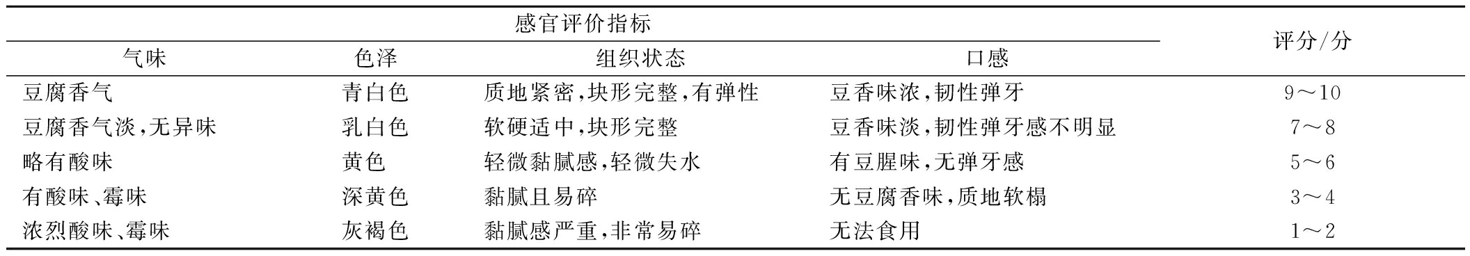 感官评价指标气味色泽组织状态口感评分/分豆腐香气青白色质地紧密,块形完整,有弹性豆香味浓,韧性弹牙9~10豆腐香气淡,无异味乳白色软硬适中,块形完整豆香味淡,韧性弹牙感不明显7~8略有酸味黄色 轻微黏腻感,轻微失水有豆腥味,无弹牙感5~6有酸味、霉味深黄色黏腻且易碎无豆腐香味,质地软榻3~4浓烈酸味、霉味灰褐色黏腻感严重,非常易碎无法食用1~2