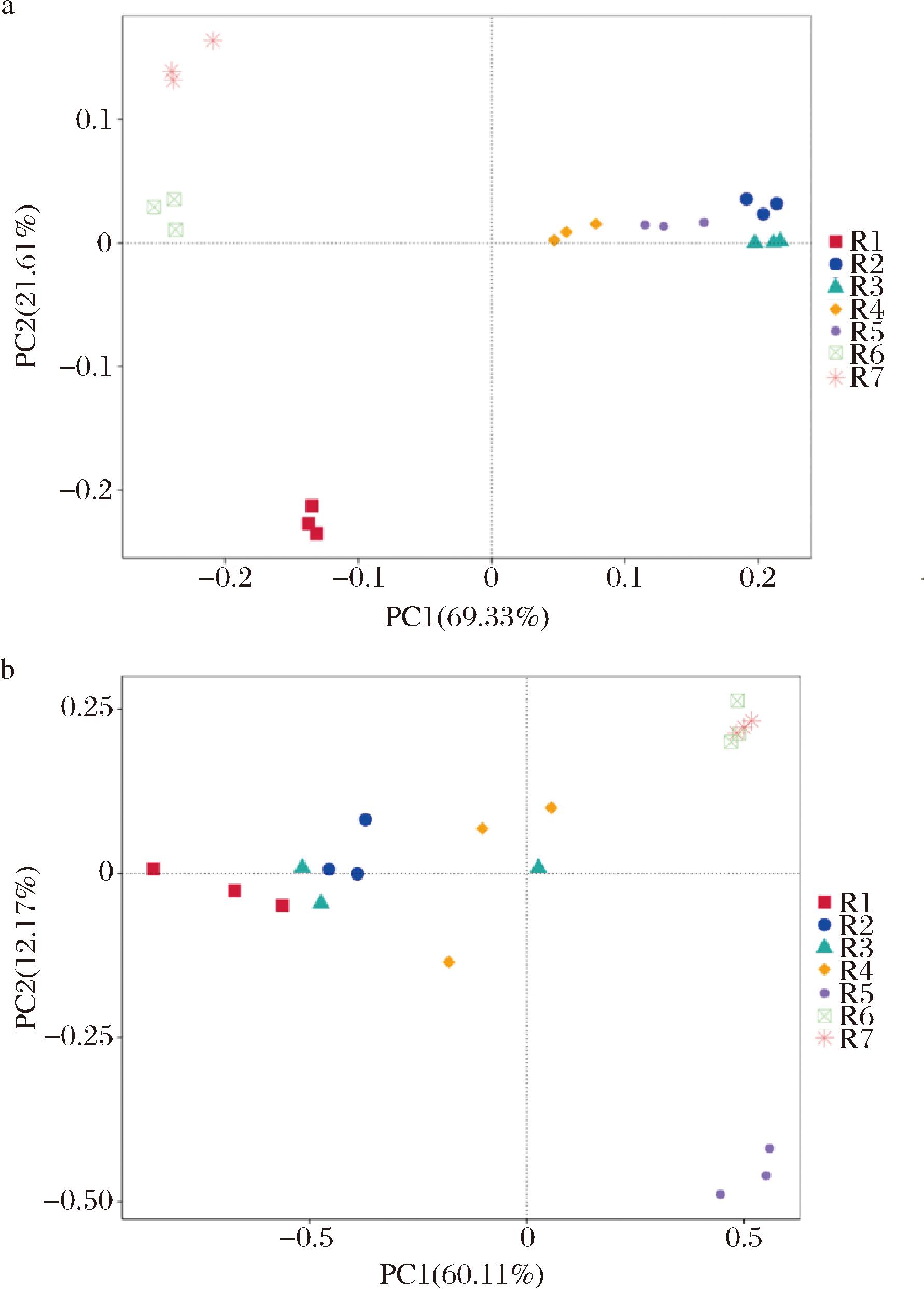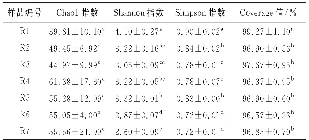 样品编号Chao1指数Shannon指数Simpson指数Coverage值/%R139.81±10.10a4.10±0.27a0.90±0.02a99.27±1.10aR249.45±6.92a3.22±0.16bc0.84±0.02b96.90±0.53bR344.97±9.99a3.05±0.09cd0.78±0.01c97.67±0.95bR461.38±17.30a3.22±0.05bc0.78±0.07c96.37±0.95bR555.28±12.99a3.32±0.01b0.83±0.00b96.90±0.60bR655.05±4.00a2.87±0.07d0.72±0.01d96.57±0.23bR755.56±21.99a2.60±0.09e0.72±0.01d96.83±0.70b