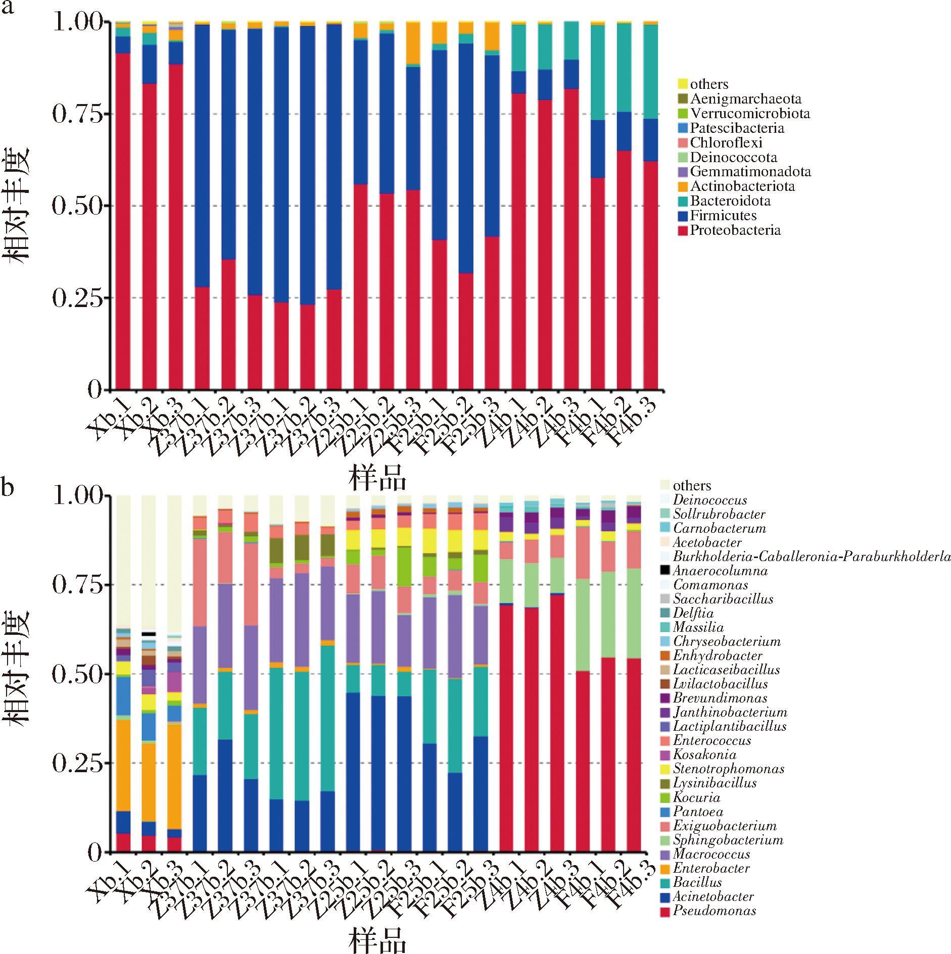 将贮藏初期的新鲜样品编号为Xb;贮藏中期的样品分别编号为Z37b、Z25b、Z4b;贮藏后期的腐败样品分别编号为F37b、F25b、F4b进行取样(分组编号按Xb、Z37b、F37b、Z25b、F25b、Z4b、F4b的顺序为R1~R7);采用试剂盒提取基因组DNA,利用引物341F和806R对细菌的16S rRNA基因V3~V4可变区基因序列进行PCR扩增;利用ITS1F和ITS2对真菌ITS-1F可变区基因序列进行PCR扩增,后由诺禾致源科技(北京)有限公司基于Illumina NovaSeq 6000平台进行高通量测序。
