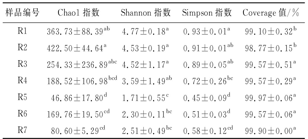 样品编号Chao1指数Shannon指数Simpson指数Coverage值/%R1363.73±88.39ab4.77±0.18a0.93±0.01a99.10±0.32bR2422.50±44.64a4.53±0.19a0.91±0.01ab98.77±0.15bR3254.33±236.89abc4.52±1.17a0.89±0.05ab99.57±0.51aR4188.52±106.98bcd3.59±1.49ab0.72±0.26bc99.57±0.29aR546.86±17.80d1.71±0.55c0.45±0.09d99.97±0.06aR6169.76±19.50cd2.30±0.11bc0.51±0.03d99.57±0.06aR780.60±5.29cd2.51±0.49bc0.58±0.12cd99.90±0.00a