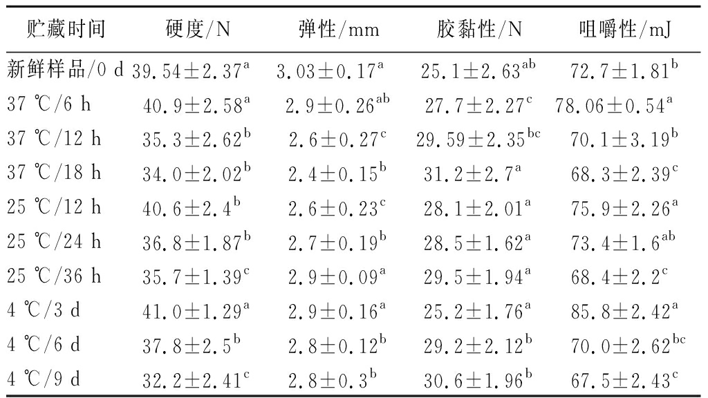 贮藏时间硬度/N弹性/mm胶黏性/N咀嚼性/mJ新鲜样品/0 d39.54±2.37a 3.03±0.17a 25.1±2.63ab72.7±1.81b37 ℃/6 h40.9±2.58a2.9±0.26ab27.7±2.27c78.06±0.54a37 ℃/12 h35.3±2.62b2.6±0.27c29.59±2.35bc70.1±3.19b37 ℃/18 h34.0±2.02b2.4±0.15b31.2±2.7a 68.3±2.39c25 ℃/12 h40.6±2.4b2.6±0.23c28.1±2.01a75.9±2.26a25 ℃/24 h36.8±1.87b2.7±0.19b28.5±1.62a73.4±1.6ab 25 ℃/36 h35.7±1.39c2.9±0.09a29.5±1.94a68.4±2.2c 4 ℃/3 d41.0±1.29a2.9±0.16a25.2±1.76a85.8±2.42a4 ℃/6 d37.8±2.5b2.8±0.12b29.2±2.12b70.0±2.62bc4 ℃/9 d32.2±2.41c2.8±0.3b30.6±1.96b67.5±2.43c