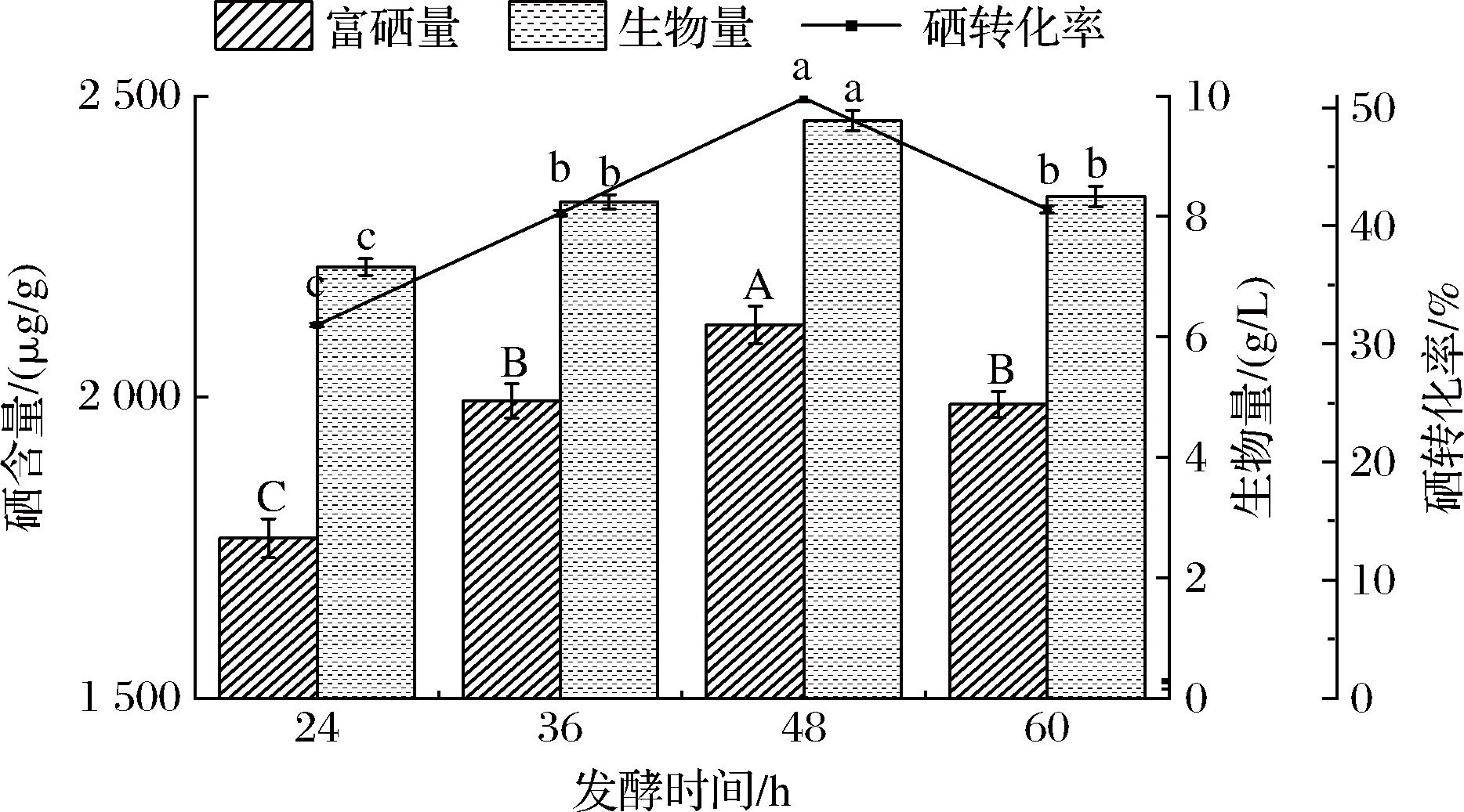 发酵时间会直接影响酵母的生长繁殖与硒含量,在适宜的发酵时间内,酵母细胞能够充分利用营养物质进行生长和繁殖。由图8可知,当发酵时间为24~48 h时,酵母富硒量及生物量随着发酵时间的延长而缓步增加,当发酵时间为48 h时,富硒量及生物量达到最大值;而在发酵时间为60 h时,酵母的富硒量及生物量低于48 h。这可能是因为随着发酵时间的延长,发酵液中的营养成分消耗殆尽,从而影响其对硒的富集能力[19]。因此选择适宜酵母生长和富硒的48 h作为富硒发酵培养的时间。