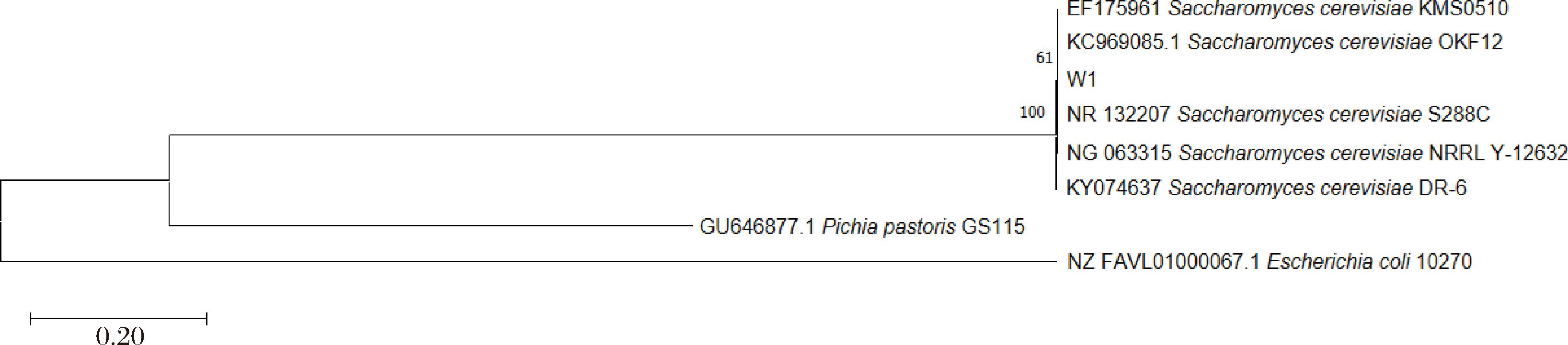 W1酵母菌株18S rDNA基因PCR扩增结果如图3所示:条带亮度较高,基因片段大小为1 800 bp左右,与目的产物大小相符,表明PCR扩增所得产物可用于后续的序列测定。将18S rDNA基因扩增产物送至生工生物工程(上海)股份有限公司测序,运用BLAST同源性分析基因测序结果,构建系统发育树。结果如图4所示,W1酵母菌株与酿酒酵母在同一进化分支,同源性最高。因此,将W1酵母菌株鉴定为酿酒酵母。
