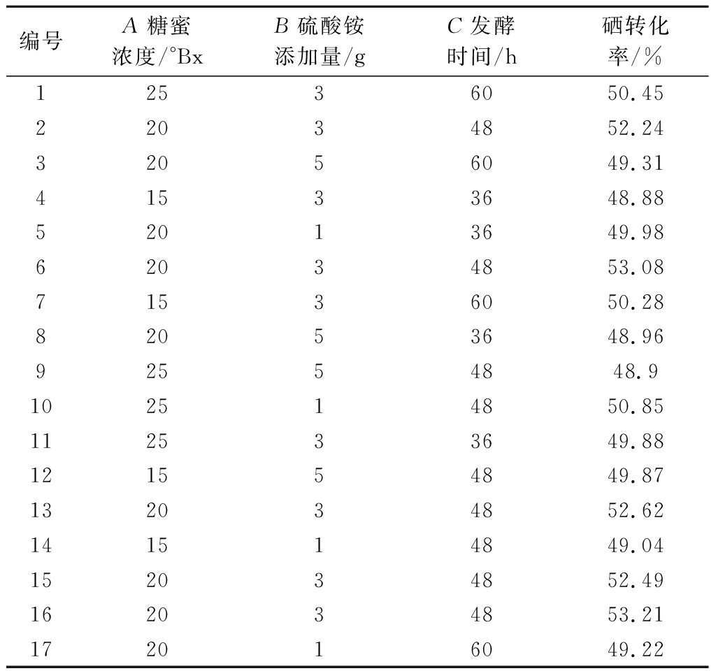 以糖蜜浓度25 °Bx,硫酸铵3.0 g/L,硒添加量30 μg/mL,发酵时间36 h为初始发酵条件,分别考察糖蜜浓度(15、20、25、30 °Bx)、硫酸铵添加量(1、3、5、7 g)、硒添加量(10、20、30、40、50 μg/mL)及发酵时间(24、36、48、60 h)对酵母富硒能力的影响。分别选取富硒酵母发酵条件中对酵母富硒影响最为显著的3个因素(糖蜜浓度、硫酸铵添加量及发酵时间)为考察因素,以硒转化率为响应值,设计了3因素3水平响应面分析实验(表1),进一步优化发酵条件。