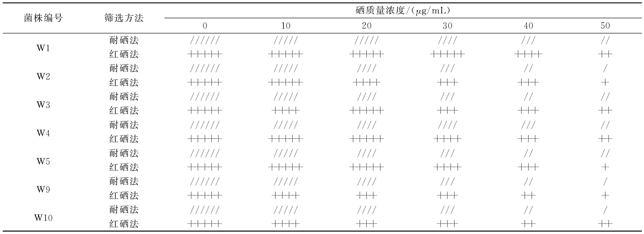 菌株编号筛选方法硒质量浓度/(μg/mL)01020304050W1耐硒法/////////////////////////红硒法++++++++++++++++++++++++++W2耐硒法/////////////////////红硒法+++++++++++++++++++++W3耐硒法//////////////////////红硒法++++++++++++++++++++++W4耐硒法////////////////////////红硒法++++++++++++++++++++++++W5耐硒法//////////////////////红硒法+++++++++++++++++++++++W9耐硒法/////////////////////红硒法++++++++++++++++++W10耐硒法/////////////////////红硒法+++++++++++++++++++