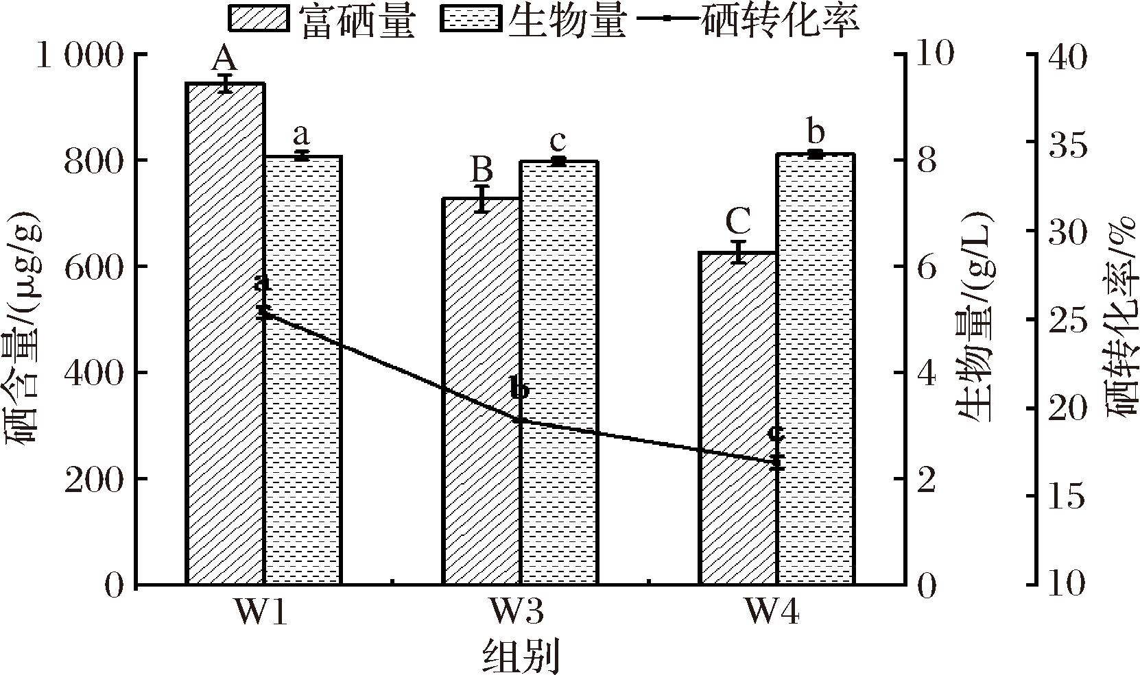 将W1、W3和W4酵母菌株以5%的接种量分别接种至糖蜜基础培养基中进行富硒发酵,酵母富硒含量如图1所示,W1、W3及W4酵母菌株的富硒量分别为943.25、726.51、626.02 μg/g,生物量分别为8.07、7.96、8.1 g/L,硒转化率分别为25.37%、19.28%及16.9%。此结果表明,W1酵母菌株在30 μg/mL的硒浓度下富硒能力最强,因此选用W1酵母菌株作为后续实验菌株。