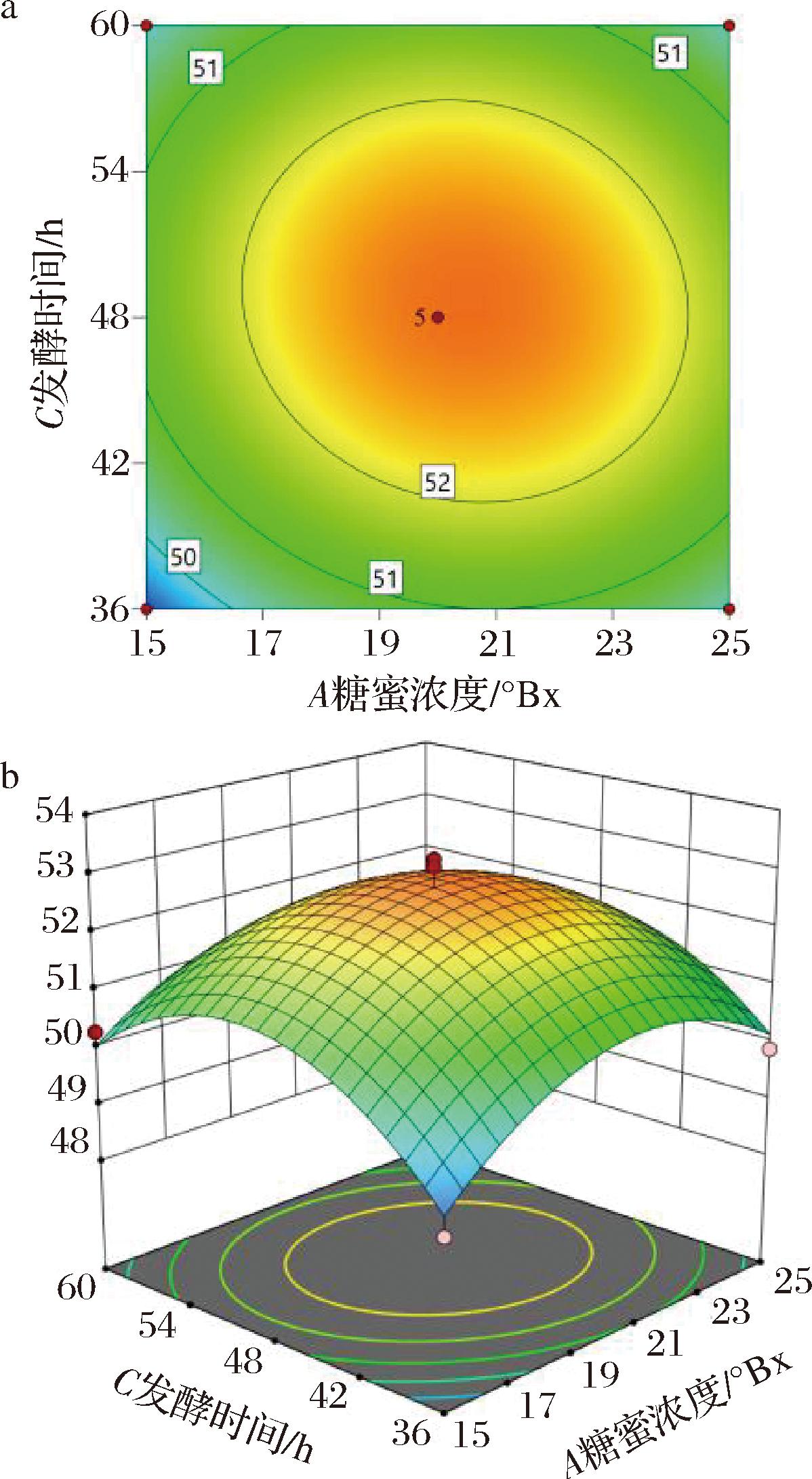 响应面优化法是一种运用统计学手段构建响应面模型,对多个设计变量进行系统优化,以期确定一组最优设计参数的方法。由表3响应面优化结果和表4方差分析可知,表中回归模型“P”值为0.000 3,极显著,表中相关模型系数R2为0.964 8,校正系数模型为0.919 5,表明模型准确度高,可用该模型对真实情况进行预测。对所得硒转化率进行回归拟合,得到多项回归方程:硒转化率=52.73+0.251 3A-0.256 2B+0.195 0C-0.695 0AB-0.207 5AC+0.277 5BC-1.28A2-1.78B2-1.58C2。