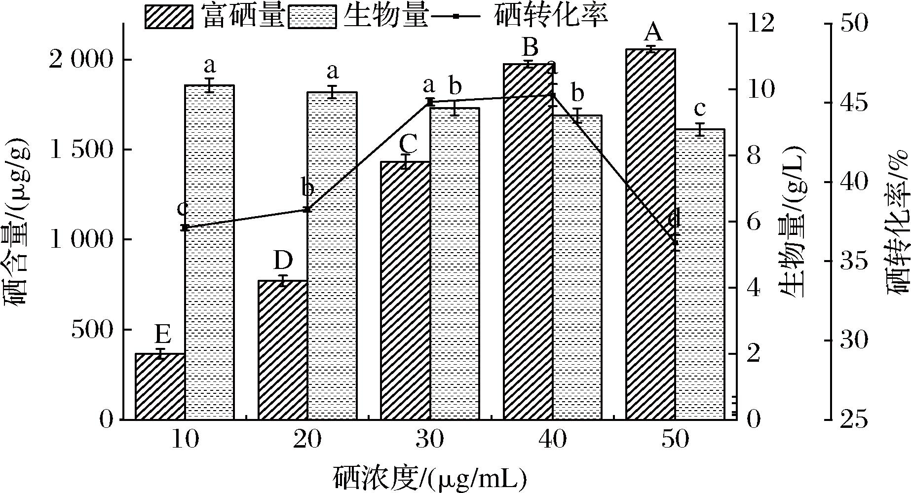 将筛选出的酵母菌株以5%的接种量接种至糖蜜基础培养基,30 ℃、180 r/min培养12 h后加入硒母液使硒质量浓度为30 μg/mL。发酵结束后离心、洗涤菌体,并用真空冷冻干燥机冻干,测量其富硒量及生物量。