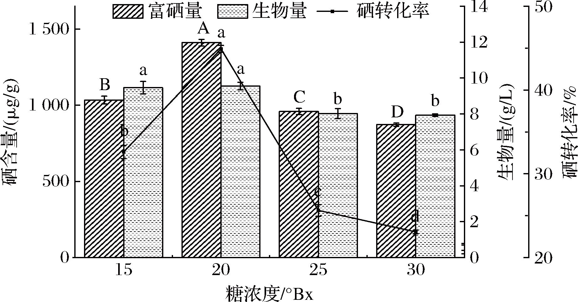 糖蜜是影响酵母富硒的主要因素之一,其浓度的高低对酵母的生长速度和代谢活性具有显著影响。由图5可知,当糖蜜浓度为20 °Bx时,酵母的富硒量及生物量达到最大值;而为25~30 °Bx时随着糖蜜浓度逐渐增大,富硒量、生物量及硒转化率逐渐减小,可能是因为高糖浓度通过改变渗透压、代谢途径以及抑制细胞生长等方式,对酵母细胞转化硒产生了负面影响[16],因此选择20 °Bx作为培养基的糖蜜浓度。
