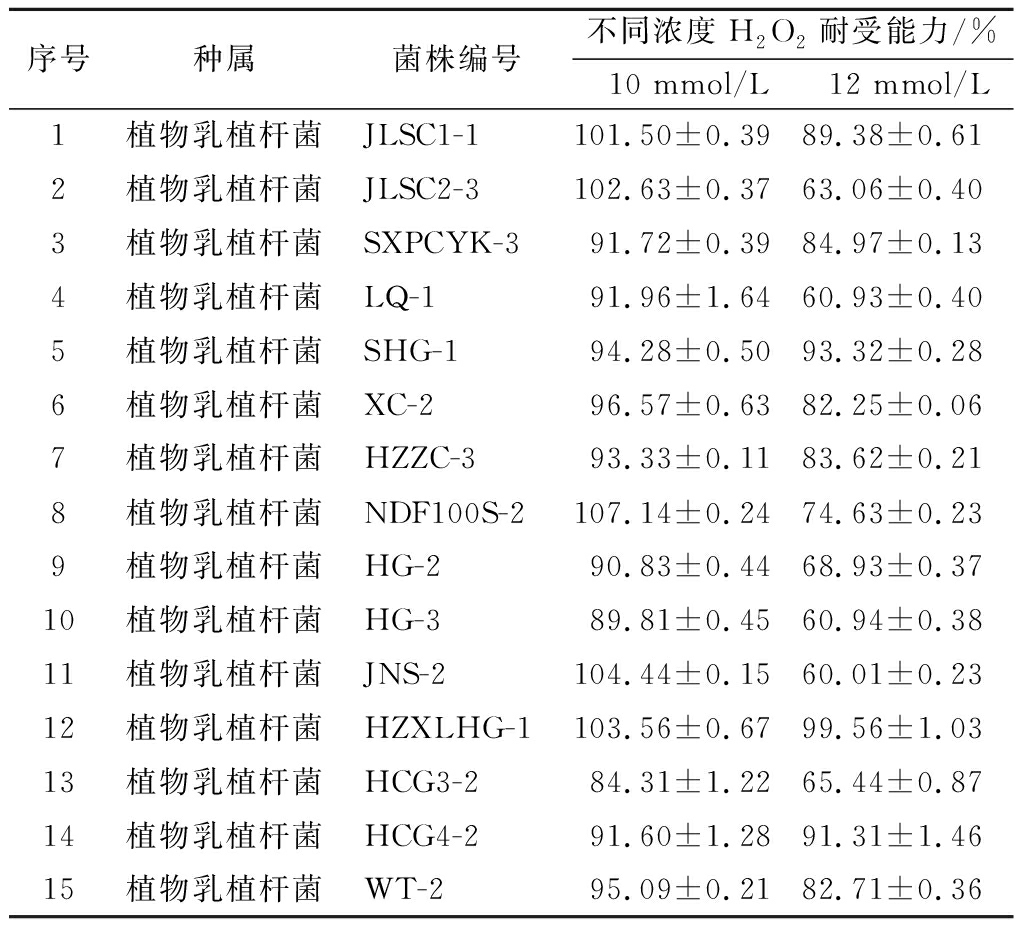序号种属菌株编号不同浓度H2O2耐受能力/%10 mmol/L12 mmol/L1植物乳植杆菌JLSC1-1101.50±0.3989.38±0.612植物乳植杆菌JLSC2-3102.63±0.3763.06±0.403植物乳植杆菌SXPCYK-391.72±0.3984.97±0.134植物乳植杆菌LQ-191.96±1.6460.93±0.405植物乳植杆菌SHG-194.28±0.5093.32±0.286植物乳植杆菌XC-296.57±0.6382.25±0.067植物乳植杆菌HZZC-393.33±0.1183.62±0.218植物乳植杆菌NDF100S-2107.14±0.2474.63±0.239植物乳植杆菌HG-290.83±0.4468.93±0.3710植物乳植杆菌HG-389.81±0.4560.94±0.3811植物乳植杆菌JNS-2104.44±0.1560.01±0.2312植物乳植杆菌HZXLHG-1103.56±0.6799.56±1.0313植物乳植杆菌HCG3-284.31±1.2265.44±0.8714植物乳植杆菌HCG4-291.60±1.2891.31±1.4615植物乳植杆菌WT-295.09±0.2182.71±0.36