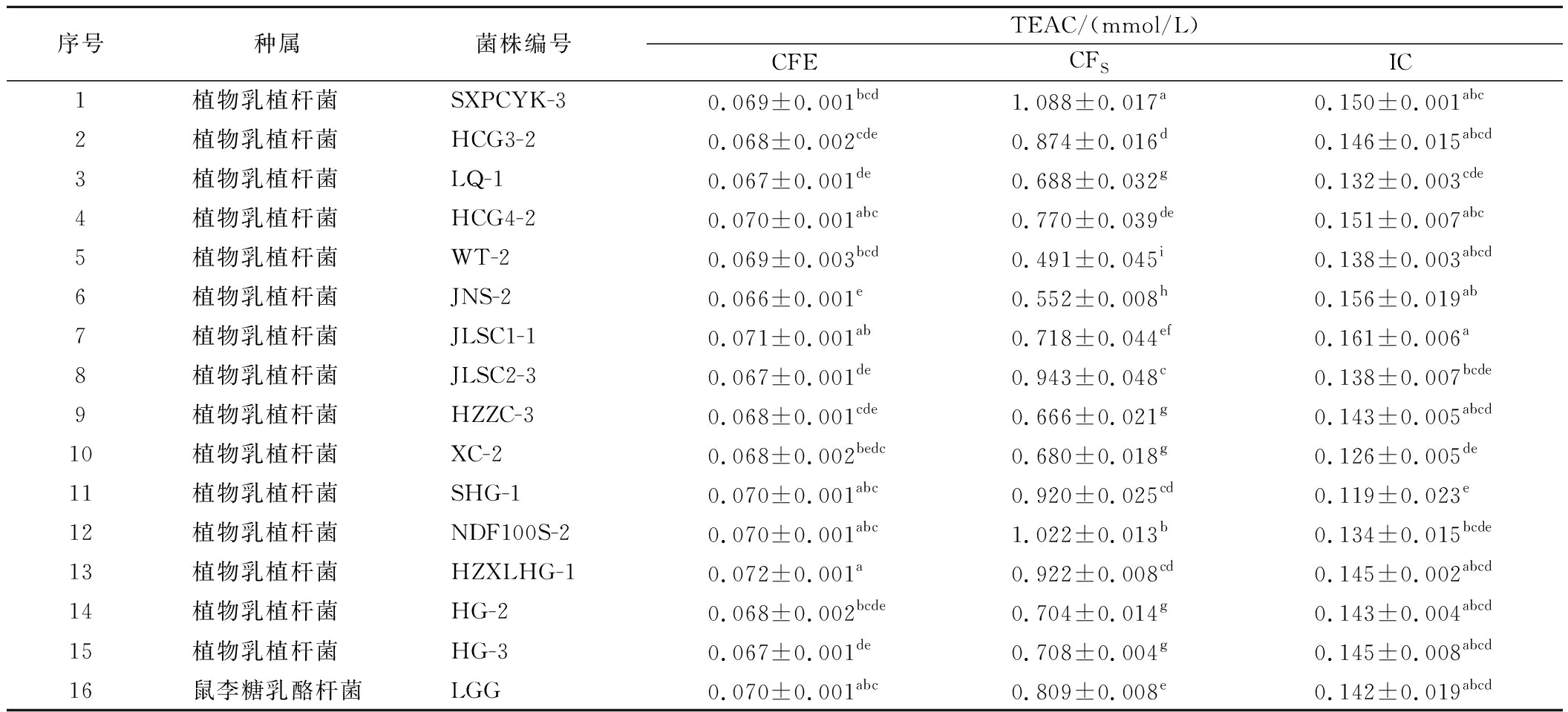 序号种属菌株编号TEAC/(mmol/L)CFECFSIC1植物乳植杆菌 SXPCYK-30.069±0.001bcd1.088±0.017a0.150±0.001abc2植物乳植杆菌 HCG3-20.068±0.002cde0.874±0.016d0.146±0.015abcd3植物乳植杆菌 LQ-10.067±0.001de0.688±0.032g0.132±0.003cde4植物乳植杆菌 HCG4-20.070±0.001abc0.770±0.039de0.151±0.007abc5植物乳植杆菌 WT-20.069±0.003bcd0.491±0.045i0.138±0.003abcd6植物乳植杆菌 JNS-20.066±0.001e0.552±0.008h0.156±0.019ab7植物乳植杆菌 JLSC1-10.071±0.001ab0.718±0.044ef0.161±0.006a8植物乳植杆菌 JLSC2-30.067±0.001de0.943±0.048c0.138±0.007bcde9植物乳植杆菌 HZZC-30.068±0.001cde0.666±0.021g0.143±0.005abcd10植物乳植杆菌 XC-20.068±0.002bedc0.680±0.018g0.126±0.005de11植物乳植杆菌 SHG-10.070±0.001abc0.920±0.025cd0.119±0.023e12植物乳植杆菌 NDF100S-20.070±0.001abc1.022±0.013b0.134±0.015bcde13植物乳植杆菌 HZXLHG-10.072±0.001a0.922±0.008cd0.145±0.002abcd14植物乳植杆菌 HG-20.068±0.002bcde0.704±0.014g0.143±0.004abcd15植物乳植杆菌 HG-30.067±0.001de0.708±0.004g0.145±0.008abcd16鼠李糖乳酪杆菌LGG0.070±0.001abc0.809±0.008e0.142±0.019abcd