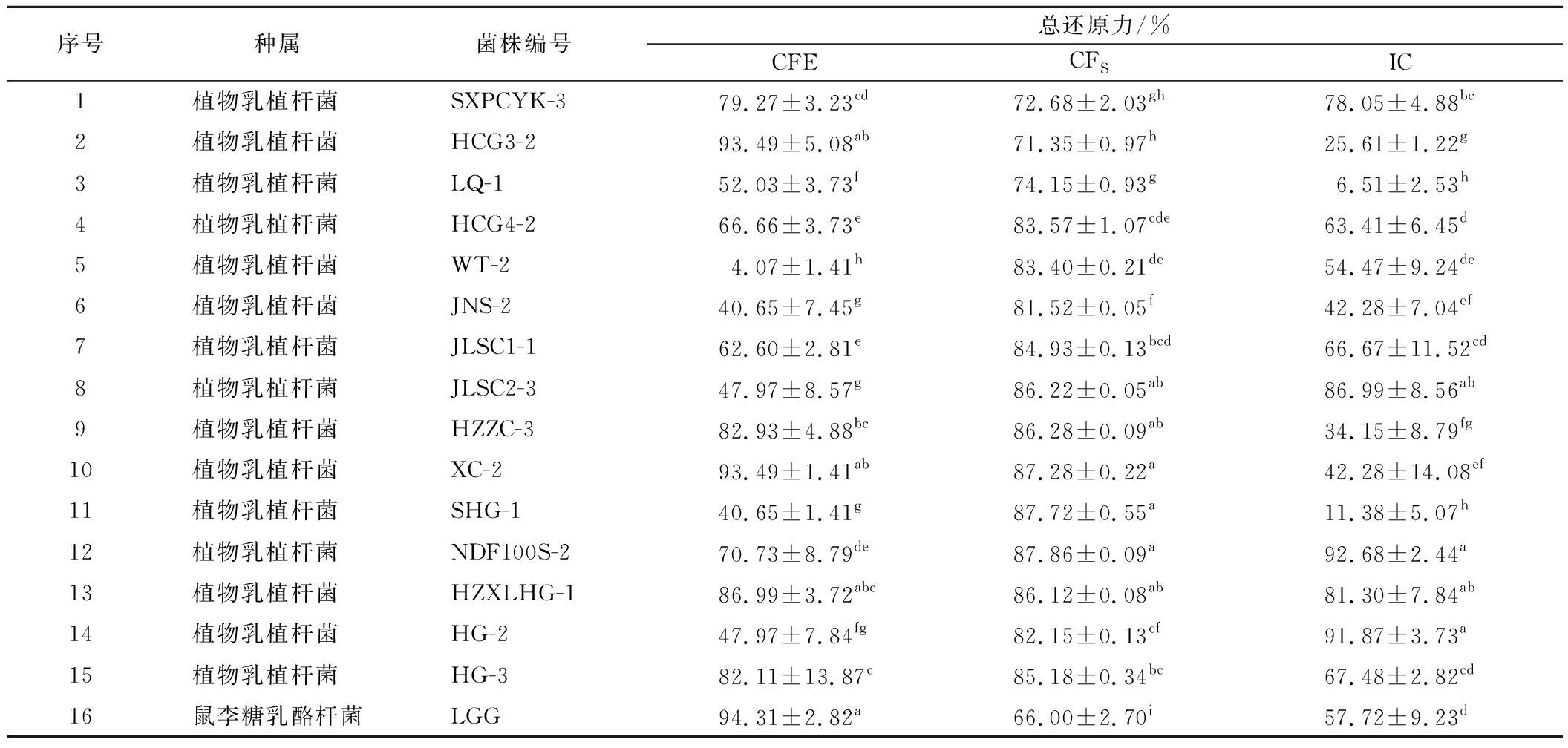 序号种属菌株编号总还原力/%CFECFSIC1植物乳植杆菌 SXPCYK-379.27±3.23cd72.68±2.03gh78.05±4.88bc2植物乳植杆菌 HCG3-293.49±5.08ab71.35±0.97h25.61±1.22g3植物乳植杆菌 LQ-152.03±3.73f74.15±0.93g6.51±2.53h4植物乳植杆菌 HCG4-266.66±3.73e83.57±1.07cde63.41±6.45d5植物乳植杆菌 WT-24.07±1.41h83.40±0.21de54.47±9.24de6植物乳植杆菌 JNS-240.65±7.45g81.52±0.05f42.28±7.04ef7植物乳植杆菌 JLSC1-162.60±2.81e84.93±0.13bcd66.67±11.52cd8植物乳植杆菌 JLSC2-347.97±8.57g86.22±0.05ab86.99±8.56ab9植物乳植杆菌 HZZC-382.93±4.88bc86.28±0.09ab34.15±8.79fg10植物乳植杆菌 XC-293.49±1.41ab87.28±0.22a42.28±14.08ef11植物乳植杆菌 SHG-140.65±1.41g87.72±0.55a11.38±5.07h12植物乳植杆菌 NDF100S-270.73±8.79de87.86±0.09a92.68±2.44a13植物乳植杆菌 HZXLHG-186.99±3.72abc86.12±0.08ab81.30±7.84ab14植物乳植杆菌 HG-247.97±7.84fg82.15±0.13ef91.87±3.73a15植物乳植杆菌 HG-382.11±13.87c85.18±0.34bc67.48±2.82cd16鼠李糖乳酪杆菌LGG94.31±2.82a66.00±2.70i57.72±9.23d