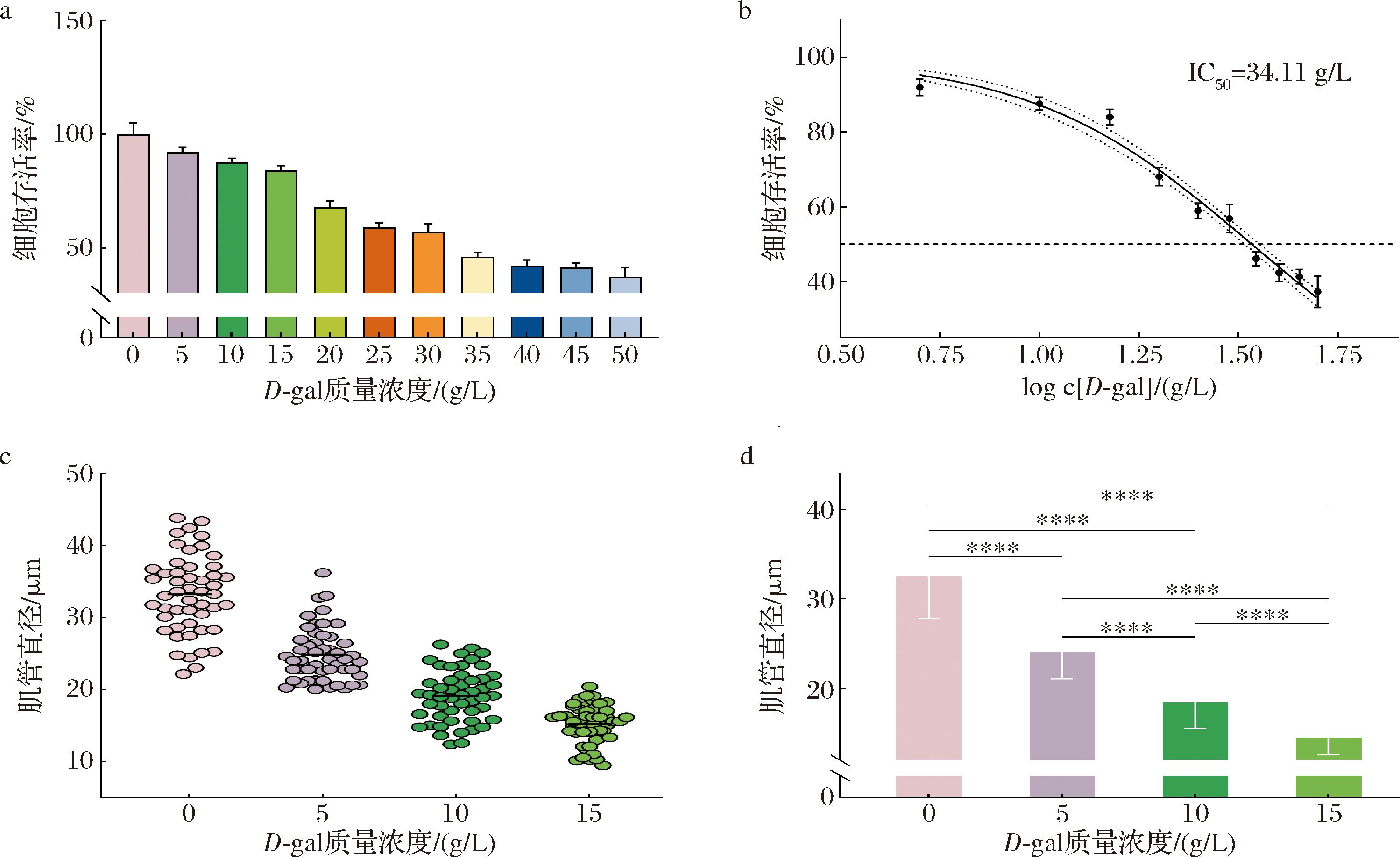 a-不同浓度D-gal干预下的细胞存活率;b-IC50值;c-不同浓度D-gal干预下的肌管直径分布图(n=50);d-不同浓度D-gal干预下的肌管直径显著性分析