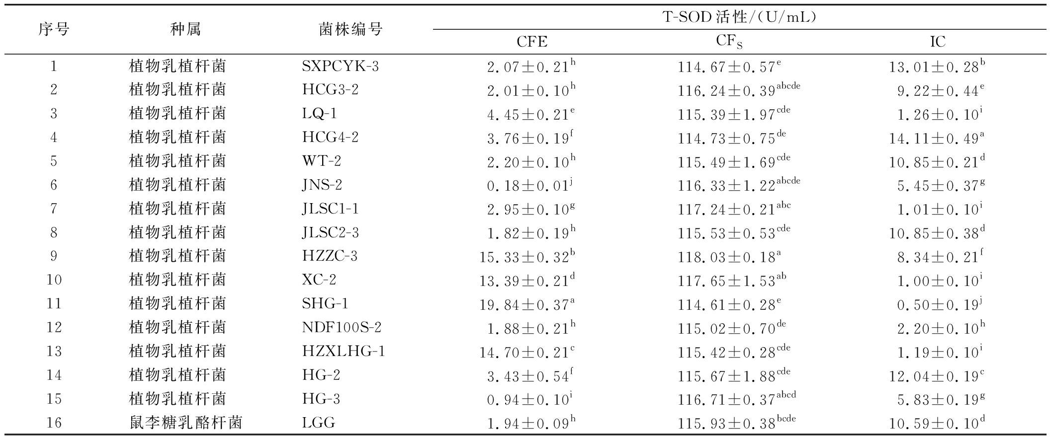 序号种属菌株编号T-SOD活性/(U/mL)CFECFSIC1植物乳植杆菌 SXPCYK-32.07±0.21h114.67±0.57e13.01±0.28b2植物乳植杆菌 HCG3-22.01±0.10h116.24±0.39abcde9.22±0.44e3植物乳植杆菌 LQ-14.45±0.21e115.39±1.97cde1.26±0.10i4植物乳植杆菌 HCG4-23.76±0.19f114.73±0.75de14.11±0.49a5植物乳植杆菌 WT-22.20±0.10h115.49±1.69cde10.85±0.21d6植物乳植杆菌 JNS-20.18±0.01j116.33±1.22abcde5.45±0.37g7植物乳植杆菌 JLSC1-12.95±0.10g117.24±0.21abc1.01±0.10i8植物乳植杆菌 JLSC2-31.82±0.19h115.53±0.53cde10.85±0.38d9植物乳植杆菌 HZZC-315.33±0.32b118.03±0.18a8.34±0.21f10植物乳植杆菌 XC-213.39±0.21d117.65±1.53ab1.00±0.10i11植物乳植杆菌 SHG-119.84±0.37a114.61±0.28e0.50±0.19j12植物乳植杆菌 NDF100S-21.88±0.21h115.02±0.70de2.20±0.10h13植物乳植杆菌 HZXLHG-114.70±0.21c115.42±0.28cde1.19±0.10i14植物乳植杆菌 HG-23.43±0.54f115.67±1.88cde12.04±0.19c15植物乳植杆菌 HG-30.94±0.10i116.71±0.37abcd5.83±0.19g16鼠李糖乳酪杆菌LGG1.94±0.09h115.93±0.38bcde10.59±0.10d