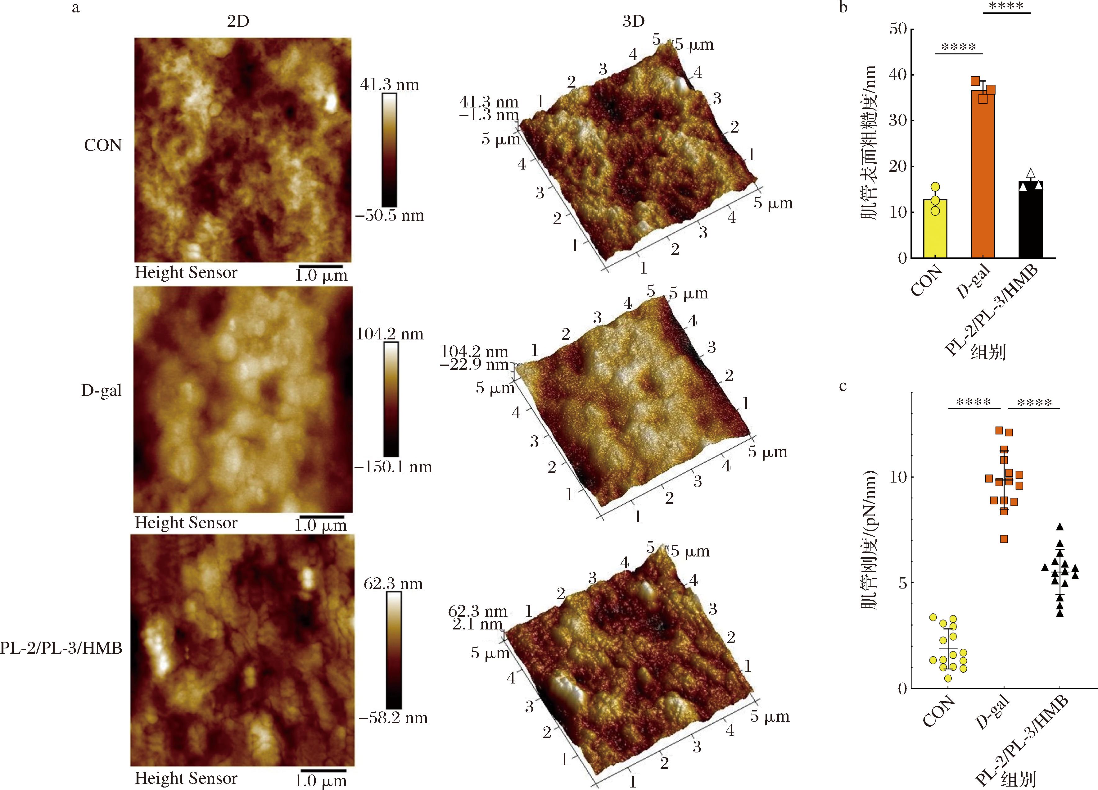 AFM是一种用于研究物质表面结构和性质的超高分辨率分析仪器[23],通过观察细胞表面形态和三维结构,获得细胞表面积、厚度、宽度和体积等量化参数,从而反映外源条件对细胞特性的影响。利用AFM研究了PL-2/PL-3/HMB组合对肌管力学特性的影响。从不同条件下的肌管表面粗糙度形貌图(图3-a)可知,与正常分化的肌管相比,D-gal处理后的肌管表面的粗糙度和刚度均明显异常增加,肌管表面粗糙度从12.85 nm增加到36.78 nm,肌管刚度从1.88 pN/nm增加到9.86 pN/nm;由图3-b和图3-c可知,L.plantarum NDF100S-2、L.plantarum HZZC-3和HMB联合使用缓解了肌管表面粗糙度和刚度的异常。