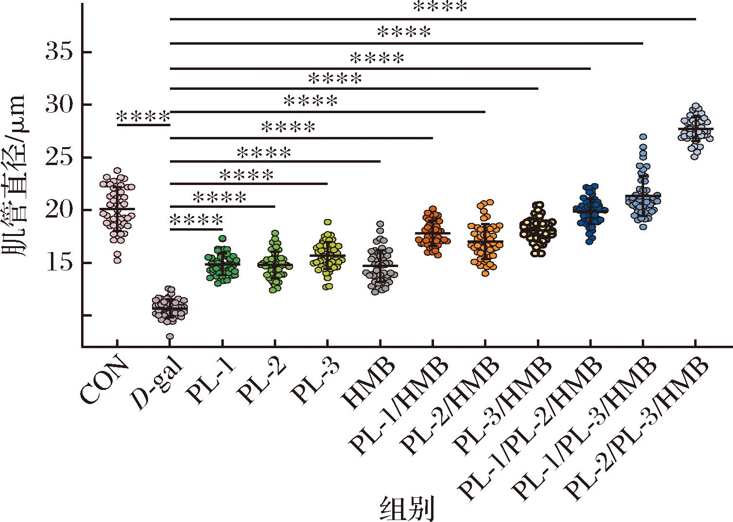 图2 植物乳植杆菌与HMB不同组合的肌管直径