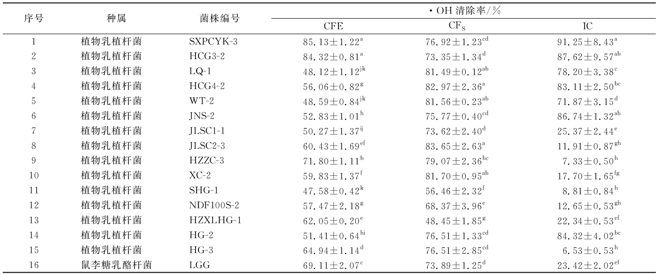 序号种属菌株编号·OH清除率/%CFECFSIC1植物乳植杆菌 SXPCYK-385.13±1.22a76.92±1.23cd91.25±8.43a2植物乳植杆菌 HCG3-284.32±0.81a73.35±1.34d87.62±9.57ab3植物乳植杆菌 LQ-148.12±1.12jk81.49±0.12ab78.20±3.38c4植物乳植杆菌 HCG4-256.06±0.82g82.97±2.36a83.11±2.50bc5植物乳植杆菌 WT-248.59±0.84jk81.56±0.23ab71.87±3.15d6植物乳植杆菌 JNS-252.83±1.01h75.77±0.40cd86.74±1.32ab7植物乳植杆菌 JLSC1-150.27±1.37ij73.62±2.40d25.37±2.44e8植物乳植杆菌 JLSC2-360.43±1.69ef83.65±2.63a11.91±0.87gh9植物乳植杆菌 HZZC-371.80±1.11b79.07±2.36bc7.33±0.50h10植物乳植杆菌 XC-259.83±1.37f81.70±0.95ab17.70±1.65fg11植物乳植杆菌 SHG-147.58±0.42k56.46±2.32f8.81±0.84h12植物乳植杆菌 NDF100S-257.47±2.18g68.37±3.96e12.65±0.53gh13植物乳植杆菌 HZXLHG-162.05±0.20e48.45±1.85g22.34±0.53ef14植物乳植杆菌 HG-251.41±0.64hi76.51±1.33cd84.32±4.02bc15植物乳植杆菌 HG-364.94±1.14d76.51±2.85cd6.53±0.53h16鼠李糖乳酪杆菌LGG69.11±2.07c73.89±1.25d23.42±2.02ef