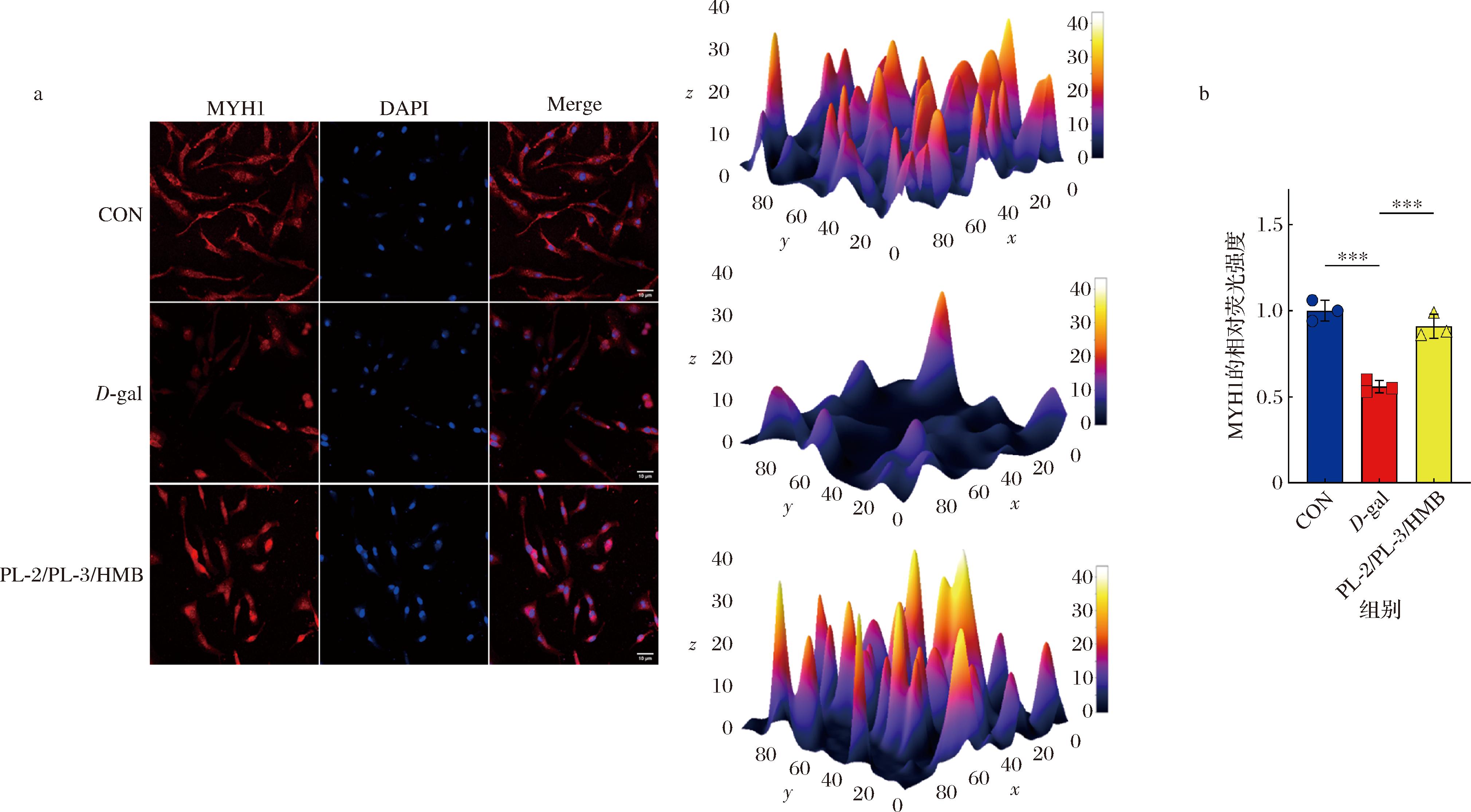 MYH1是肌球蛋白的组成成分和快肌纤维的标记物,参与骨骼肌的发育过程,负责肌肉的收缩和运动。肌少症主要表现为骨骼肌纤维,尤其是快肌纤维的体积和数量减少,且已有研究在老年肌肉中已观察到快肌纤维MYH1蛋白的丢失[24],快肌纤维MYH1蛋白的缺失可能是导致老年人肌少症的重要诱因。利用荧光染色法研究了L.plantarum NDF100S-2、L.plantarum HZZC-3和HMB组合对快肌纤维MYH1蛋白表达的影响。结果如图4-a所示,与D-gal相比,PL-2/PL-3/HMB组合显著上调了快肌纤维MYH1蛋白的表达量,MYH1相对荧光强度分析结果(图4-b)发现PL-2/PL-3/HMB组合恢复了D-gal导致的荧光强度降低,进一步验证表明PL-2/PL-3/HMB可能通过调控快肌纤维MYH1蛋白的表达延缓肌纤维的流失,从而延缓肌少症。