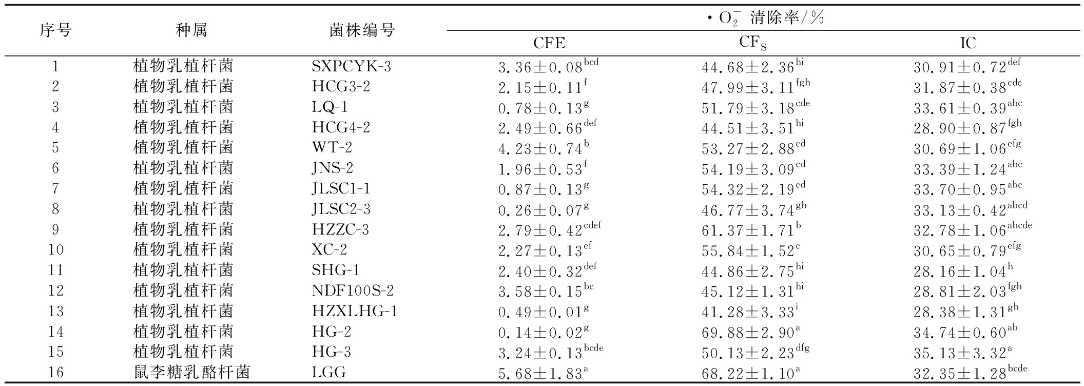 序号种属菌株编号·O-2清除率/%CFECFSIC1植物乳植杆菌 SXPCYK-33.36±0.08bcd44.68±2.36hi30.91±0.72def2植物乳植杆菌 HCG3-22.15±0.11f47.99±3.11fgh31.87±0.38cde3植物乳植杆菌 LQ-10.78±0.13g51.79±3.18cde33.61±0.39abc4植物乳植杆菌 HCG4-22.49±0.66def44.51±3.51hi28.90±0.87fgh5植物乳植杆菌 WT-24.23±0.74b53.27±2.88cd30.69±1.06efg6植物乳植杆菌 JNS-21.96±0.53f54.19±3.09cd33.39±1.24abc7植物乳植杆菌 JLSC1-10.87±0.13g54.32±2.19cd33.70±0.95abc8植物乳植杆菌 JLSC2-30.26±0.07g46.77±3.74gh33.13±0.42abcd9植物乳植杆菌 HZZC-32.79±0.42cdef61.37±1.71b32.78±1.06abcde10植物乳植杆菌 XC-22.27±0.13ef55.84±1.52c30.65±0.79efg11植物乳植杆菌 SHG-12.40±0.32def44.86±2.75hi28.16±1.04h12植物乳植杆菌 NDF100S-23.58±0.15bc45.12±1.31hi28.81±2.03fgh13植物乳植杆菌 HZXLHG-10.49±0.01g41.28±3.33i28.38±1.31gh14植物乳植杆菌 HG-20.14±0.02g69.88±2.90a34.74±0.60ab15植物乳植杆菌 HG-33.24±0.13bcde50.13±2.23dfg35.13±3.32a16鼠李糖乳酪杆菌LGG5.68±1.83a68.22±1.10a32.35±1.28bcde
