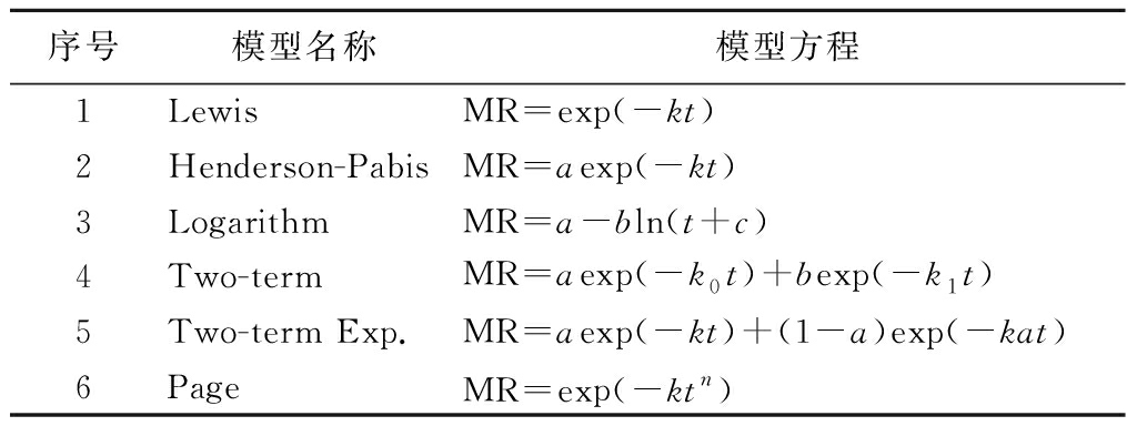 序号模型名称模型方程1LewisMR=exp(-kt)2Henderson-PabisMR=aexp(-kt)3LogarithmMR=a-bln(t+c)4Two-termMR=aexp(-k0t)+bexp(-k1t)5Two-term Exp.MR=aexp(-kt)+(1-a)exp(-kat)6PageMR=exp(-ktn)
