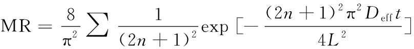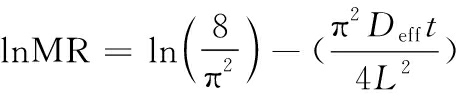 式中:Deff为有效水分扩散系数,m2/s;L为西兰花样品厚度的一半;m、n为正整数(n=0,1,2…)。lnMR与时间的关系图显示直线斜率为(-π2 Deff/4 L2)。因此,对公式(3)进行了简化,可写成公式(4):
