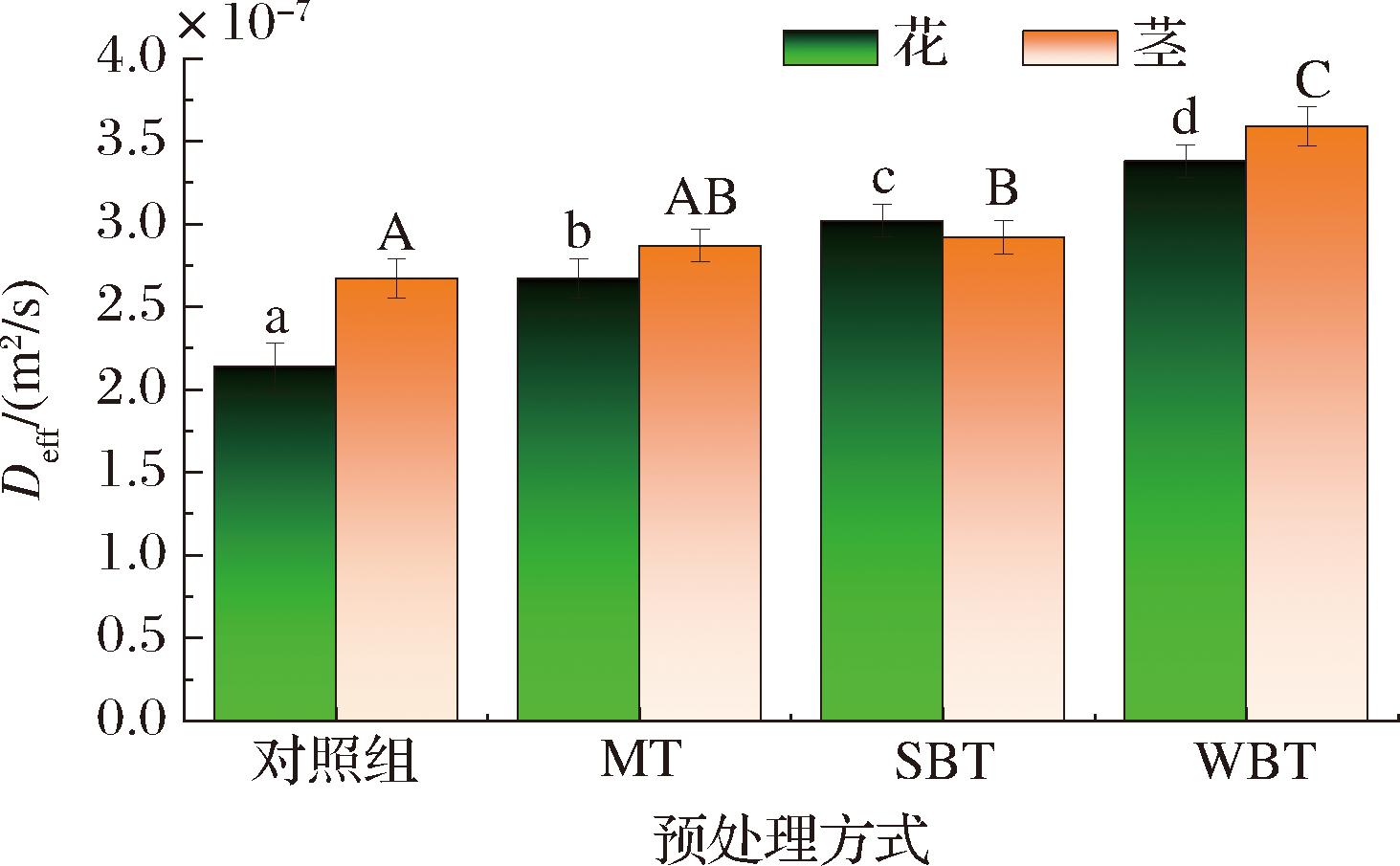 经不同预处理后的花、茎干燥过程中的Deff值如图3所示,样品的Deff值在2.14×10-7~3.59×10-7 m2/s变化,其中花、茎中WBT样品的Deff值均为最高,分别为3.38×10-7 m2/s和3.59×10-7 m2/s。与对照组相比可以发现,经MT、SBT和WBT处理后,水分子由于克服了来自西兰花基质的阻力使得有效水分扩散系数增加。由图3可知,SBT和WBT引起的软化部分比MT诱导的部分对降低传质阻力的贡献更大。因此,细胞间隙的增大更容易使细胞内的水分子向外扩散。西兰花花、茎干燥过程中出现的这一复杂现象与水分在液体和蒸气状态下的状态有关。Deff是决定干燥过程中传质的重要指标,它随含水量的变化是一个复杂的过程。它依赖于内部的传质过程,如液体扩散、蒸汽扩散、表面扩散、毛细流动和流体动力流动,而影响其内部传质的因素很多,如温度、基质特性、前处理等。RAJORIYA等[16]发现热风辅助折光窗干燥的苹果片的Deff值为2.0×10-10~1.4×10-9 m2/s。CHAO等[4]的研究结果表明,经漂烫、超声波和冻融处理后,热风干燥籽用南瓜的Deff值为2.5×10-6~4.7×10-6 m2/s,其中样品厚度、前处理、干燥方法和基质特性等因素都对Deff值有影响。水份扩散率受样品厚度、预处理、干燥方式和基质特性等因素的影响。有趣的是,SBT和WBT可以去除植物细胞和组织中被困的空气,并通过细胞软化来增加水分扩散率,从而减少阻碍[17]。