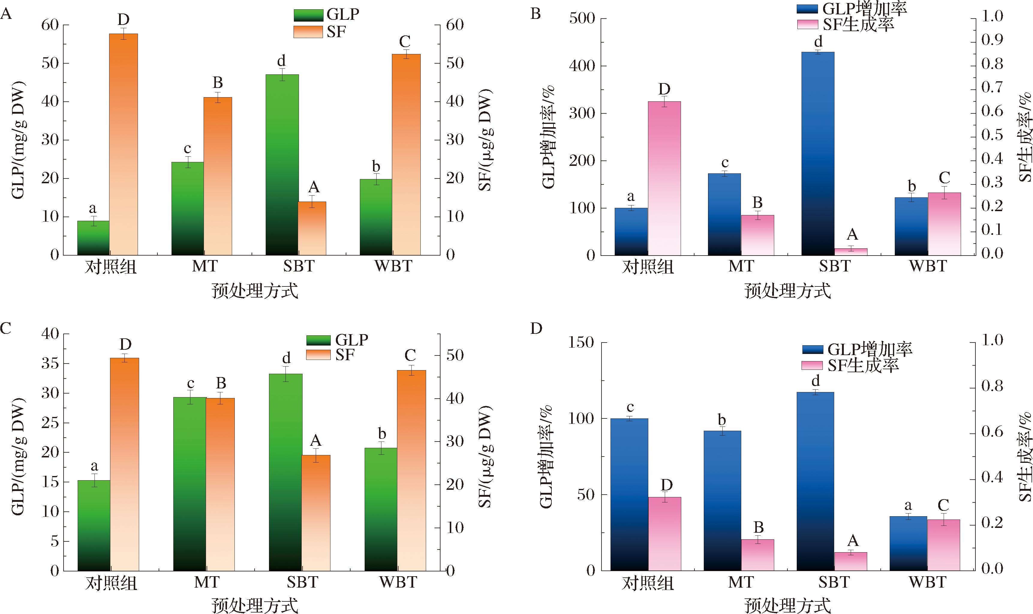 A-花中GLP和SF含量;B-花中GLP增加率和SF生成率;C-茎中GLP和SF含量;D-茎中GLP增加率和SF生成率