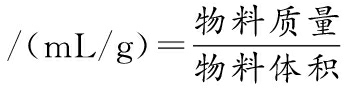 分别精确称取15 g热风干燥粉,将其送入50 mL量筒,过程中尽量使其与筒壁的黏连最小化,充分振实,直至量筒内粉体体积不发生改变为止。读取粉体体积,每个样品重复测定3次,取平均值。计算如公式(6)所示: