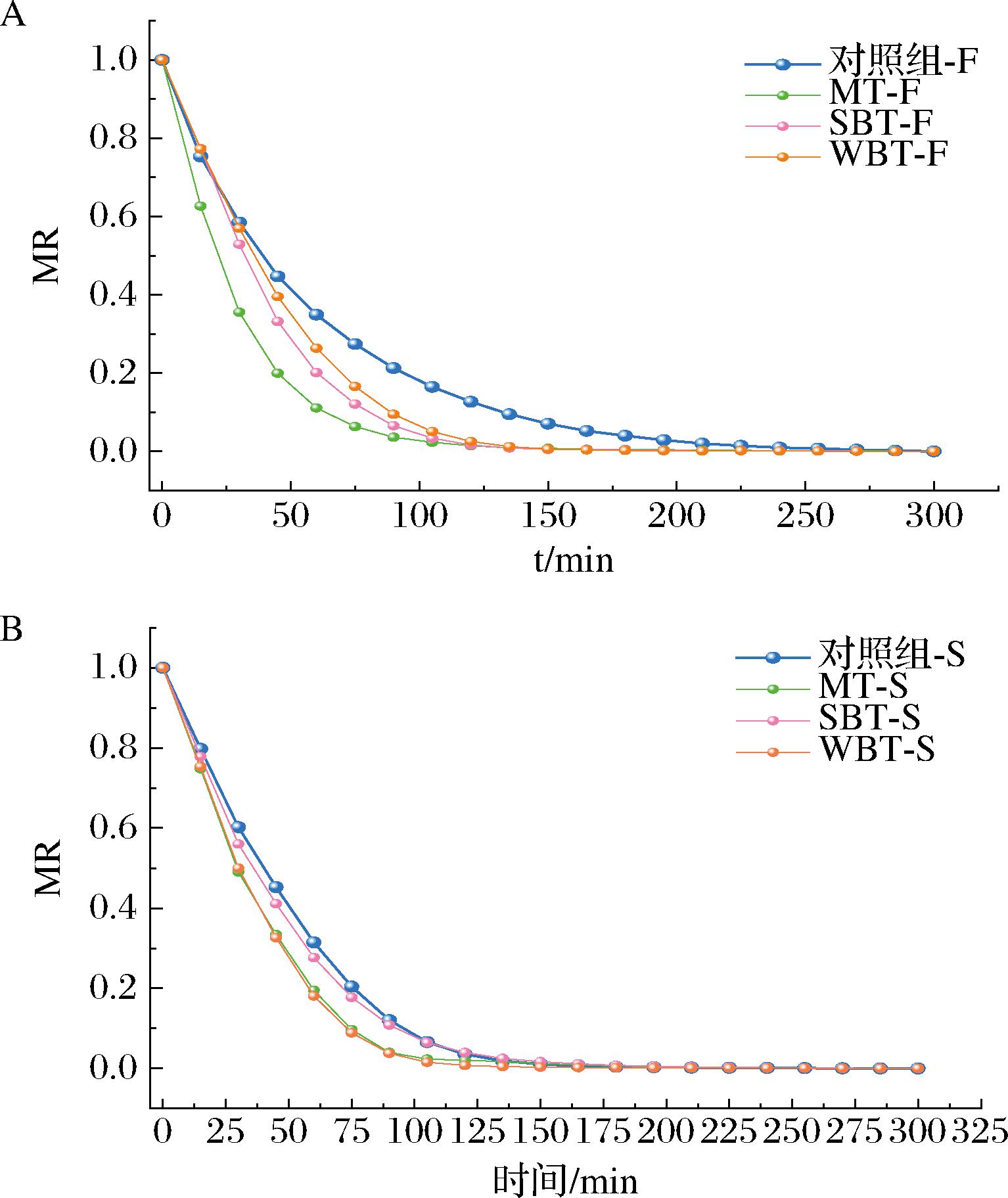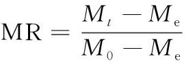 3种预处理方法在干燥性能上的差异可以通过MR与干燥时间的关系来表示。MR用于预测干燥行为,由公式(1)计算[4]: