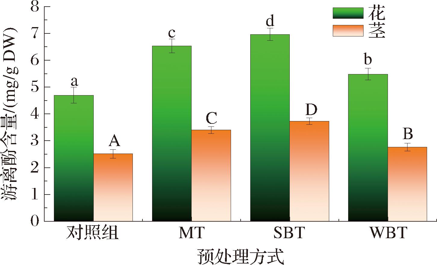 多酚类物质是西兰花中重要的营养和生物活性成分。图6显示了经MT、SBT和WBT处理后热风干燥的花、茎的总酚含量。花的总酚含量为4.69~6.96 mg/g DW,茎的总酚含量为2.51~3.73 mg/g DW,数据显示对应预处理组的花的总酚含量均高于茎。这一现象与之前THOMAS等[23]研究结果一致,在论文中,西兰花中总酚含量为3.8~6.1 mg/g DW。且花的总酚比茎高出63%。与对照组相比,MT、SBT和WBT处理提高了西兰花中总酚的含量,且3种处理间差异显著。总酚含量在MT、SBT和WBT后分别增加39%、48%和16%,其中,SBT-F样品的总酚含量最高,为6.96 mg/g DW。主要原因可能有以下几个方面。首先,热预处理可能导致细胞破坏,导致氧化酶失活[24]。3种处理后多酚含量的增加主要是由于高温下多酚氧化酶的活性下降甚至失活,从而阻止酚类物质被进一步氧化[4]。其次,热预处理导致细胞结构的破坏,包括细胞膜和细胞壁的破裂,促使某些多酚物质的释放,因此增加了酚类物质的萃取率[4]。多酚包括游离态多酚和结合态多酚,多酚含量的增加与结合多酚的释放密切相关。多酚和胞内蛋白质之间的共价键和氢键在热处理过程中可能被破坏,因此结合多酚被释放并转化为游离多酚[25]。KIM等[26]的一项研究表明,微波2~4 min后西兰花的总酚含量得以增加,这与实验结果一致,原因可能是由于酚类物质之间分子间相互作用的破坏。然而,ZHANG等[10]研究表明,与对照样品相比,微波2 min的西兰花总酚含量降低。不同微波样品的不同结果可能是不同的微波炉功率和样品大小造成的。此外,在100 ℃下漂烫的西兰花比在60 ℃漂烫的对应小花的总酚含量更低,这也可能是由于酚类化合物的热降解[27]。
