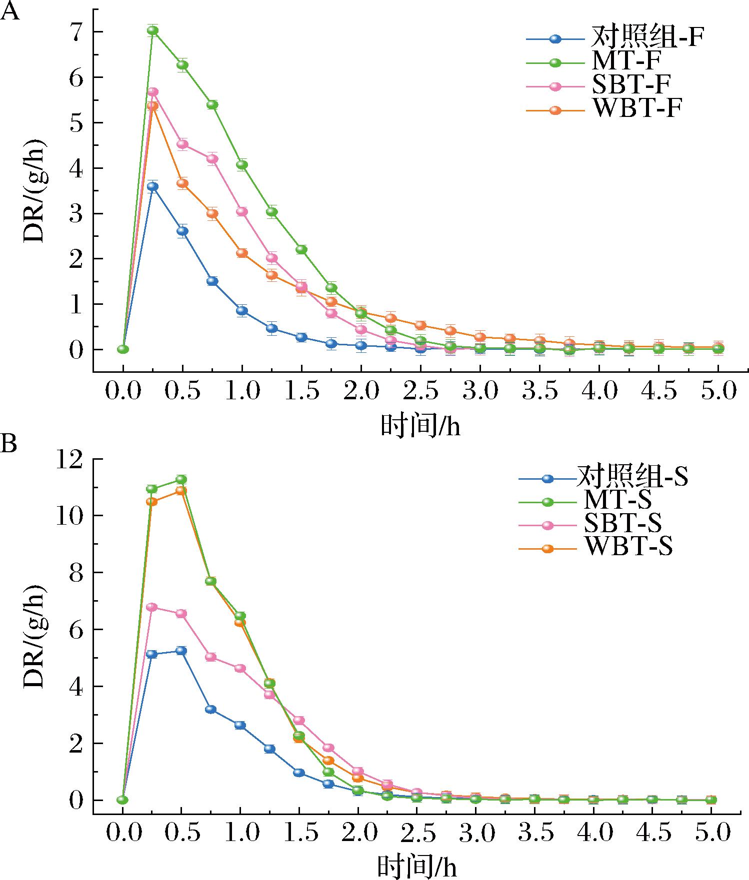 图1-A和图1-B分别显示了花、茎的MR随干燥时间的变化,其干燥曲线均符合一般食品干燥特性曲线。在初期,水分的蒸发速度很快,但在干燥后期,水分的蒸发速度没有明显的变化,干燥曲线呈现出平缓的趋势。此外,对照组的干燥时间最长,其中花的干燥时间为255 min,而经MT、SBT、WBT处理后的干燥时间分别减少到165、195、210 min,这表明3种预处理方式可以显著缩短西兰花的干燥时间。最初,主要的水分被蒸发,这可能归因于更快地去除表面水分;在105 min后,MR迅速下降,因为水分向物料表面扩散的速度减慢[11]。在南瓜、白芨、苹果等其他食物中也发现了类似的趋势[4,12-13]。DR曲线如图2-A和图2-B所示,花、茎的DR值均呈现先增加后减小的趋势。不同的是,在花的干燥过程中,没有出现恒定的干燥阶段,在0.25 h左右达到峰值,然后进入降速阶段;而茎在0.25~0.5 h经历了一个短暂的平台期,但整个干燥过程也属于降速阶段。3种预处理后的初始阶段干燥速率均比对照组的干燥速率更快,推测初始的DR值高可能是由于游离水易蒸发所致[11]。0.75 h后,大部分自由水被蒸发掉,此后蒸发的主要是结合水,同时热风干燥过程中的表面积收缩也可能会抑制水分的迁移,因此后期DR值较低。此外,热风干燥过程中西兰花表面的收缩可能会抑制水分的迁移[14]。总的来说,MT-F和MT-S具有最高的DR值,这可能是由于热能显著影响了西兰花中的水分运动。在芒果片和山药片中也具有类似的干燥过程现象[11,15]