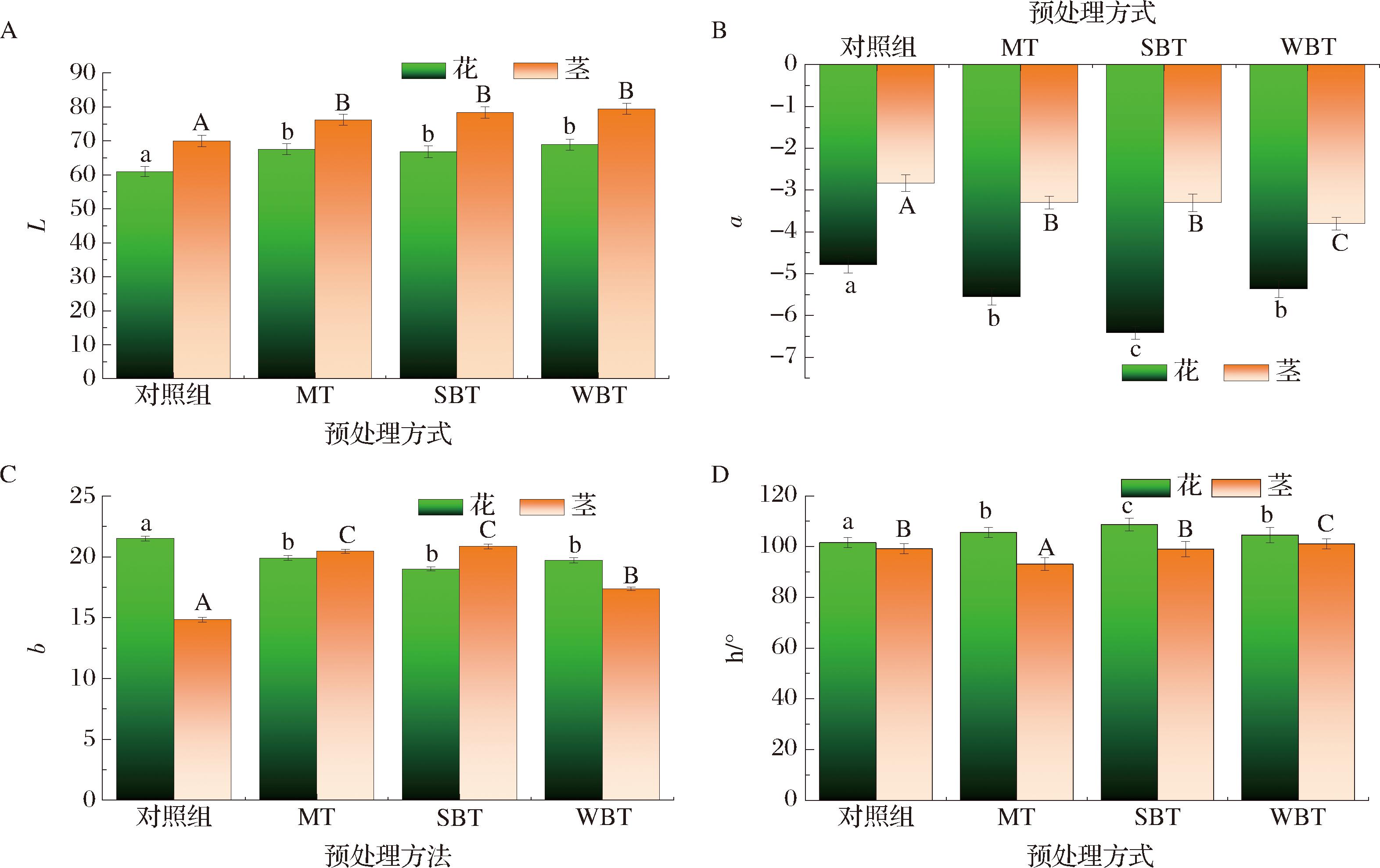 SBT处理:将花、茎分别暴露在由蒸汽锅产生的常压蒸汽中1.5 min,然后将处理过的西兰花用冰水冷却2.5 min,并排出多余的水。