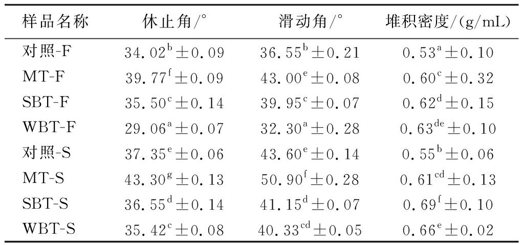 样品名称休止角/°滑动角/°堆积密度/(g/mL)对照-F34.02b±0.0936.55b±0.210.53a±0.10MT-F39.77f±0.0943.00e±0.080.60c±0.32SBT-F35.50c±0.1439.95c±0.070.62d±0.15WBT-F29.06a±0.0732.30a±0.280.63de±0.10对照-S37.35e±0.0643.60e±0.140.55b±0.06MT-S43.30g±0.1350.90f±0.280.61cd±0.13SBT-S36.55d±0.1441.15d±0.070.69f±0.10WBT-S35.42c±0.0840.33cd±0.050.66e±0.02