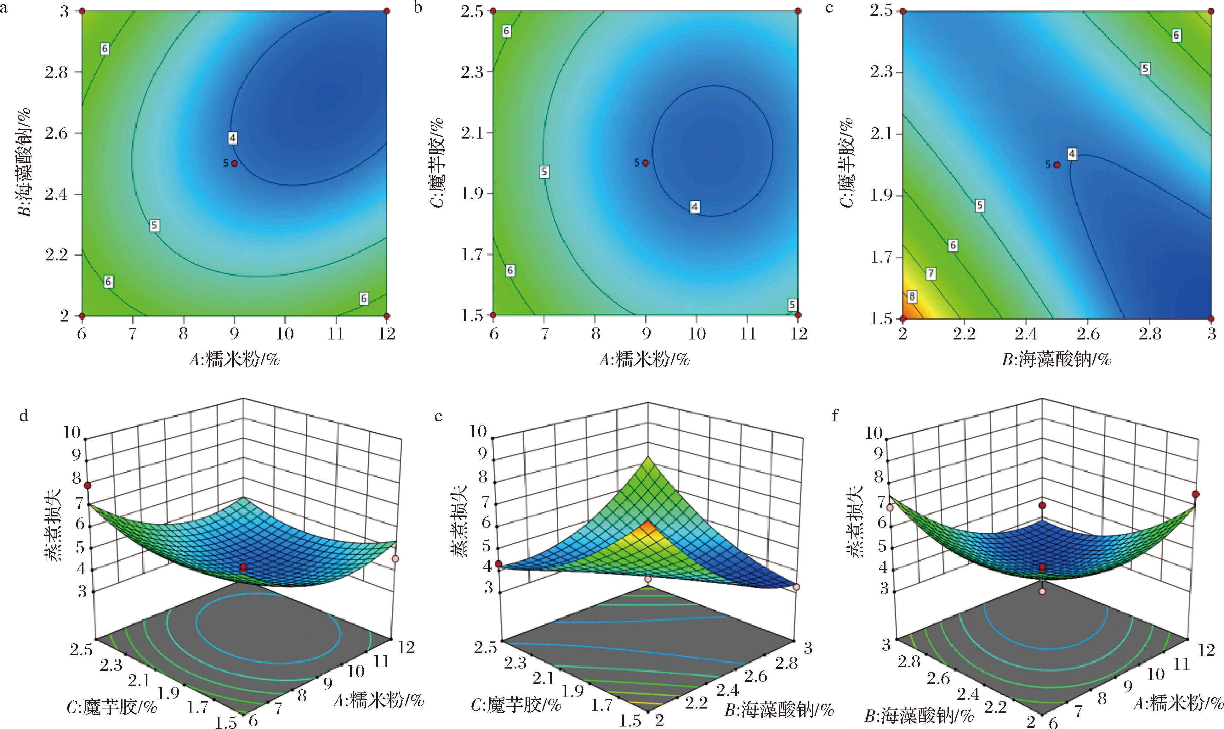 a-魔芋胶等高线图;b-海藻酸钠等高线图;c-糯米粉等高线图;d-海藻酸钠响应面图;e-糯米粉响应面图;f-魔芋胶响应面图