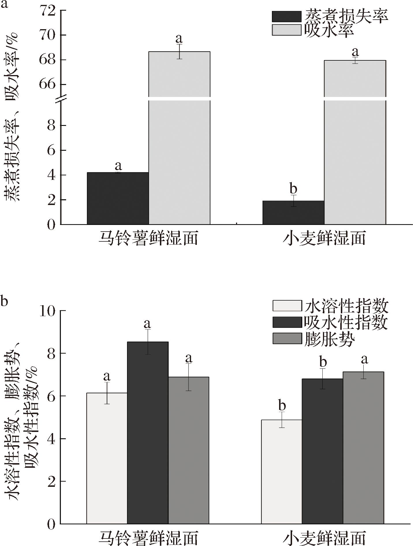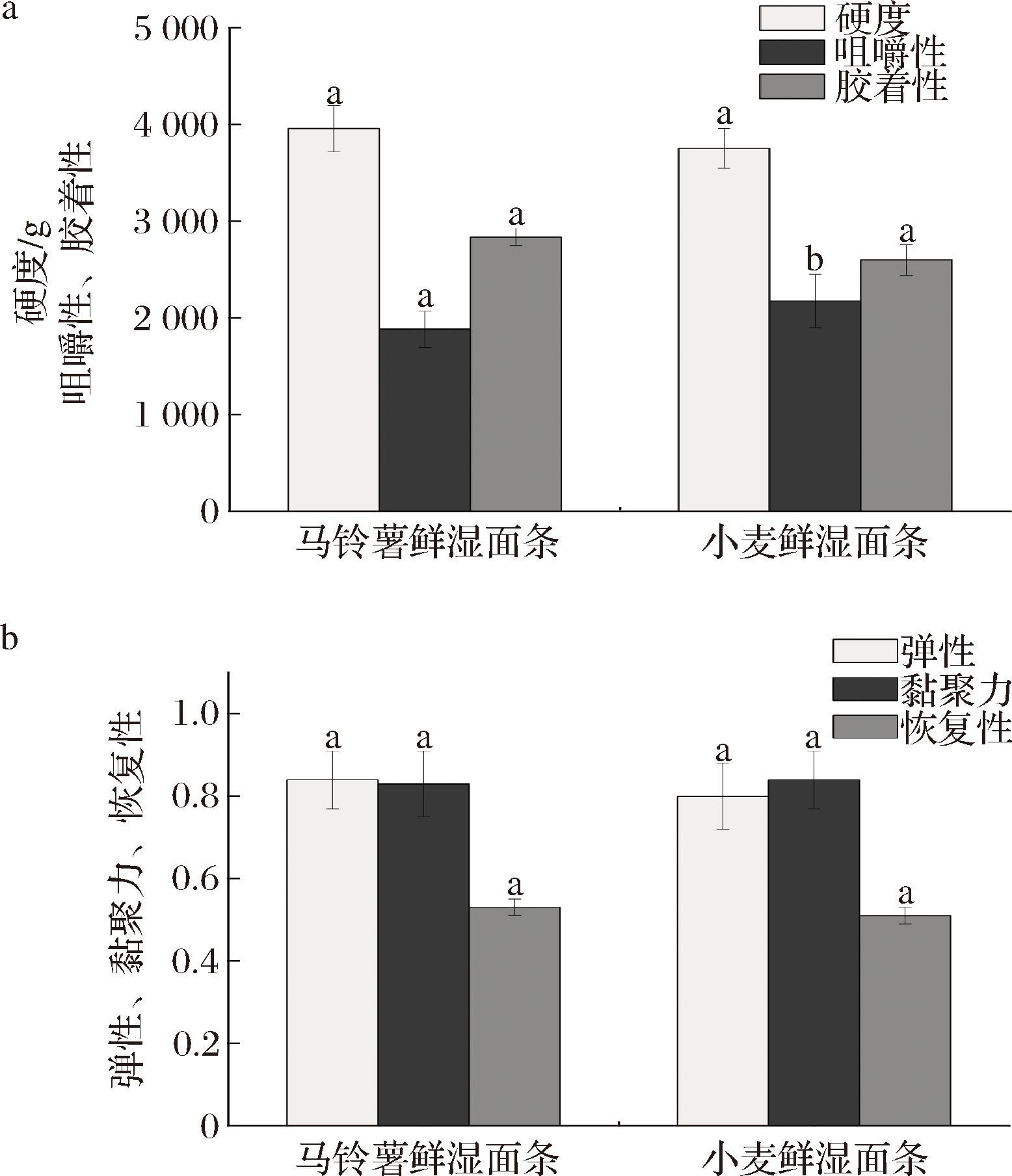 蒸煮损失率表示面条在蒸煮过程中固形物溶出的程度,能够反映面筋蛋白网络结构的强弱,是面条品质评价的重要指标之一。图5-a为面条蒸煮特性对比,可以看出,马铃薯鲜湿面条蒸煮损失率为4.20%,显著高于小麦鲜湿面条,这是因为马铃薯全粉不含面筋蛋白,其成型主要依靠外源胶体,形成的蛋白-凝胶网络结构稳定性略低于天然蛋白网络结构[20]。尽管与传统面条蒸煮损失率存在一定差距,但马铃薯鲜湿面条蒸煮损失率4.20%属于GB/T 40636—2021《挂面》规定范围,马铃薯鲜湿面条吸水率68.66%与小麦鲜湿面条67.95%无显著性差异,两者在90 s最适蒸煮时间范围内均未出现断条的现象。