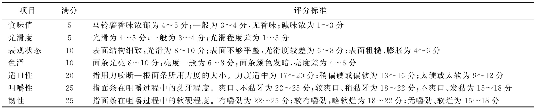 感官评价挑选10名评价员(5名男性和5名女性)在室温下进行,将煮至最佳蒸煮时间的马铃薯鲜湿面条冷却至室温后随机分装在纸杯中以供品尝,感官评价标准如表1所示。