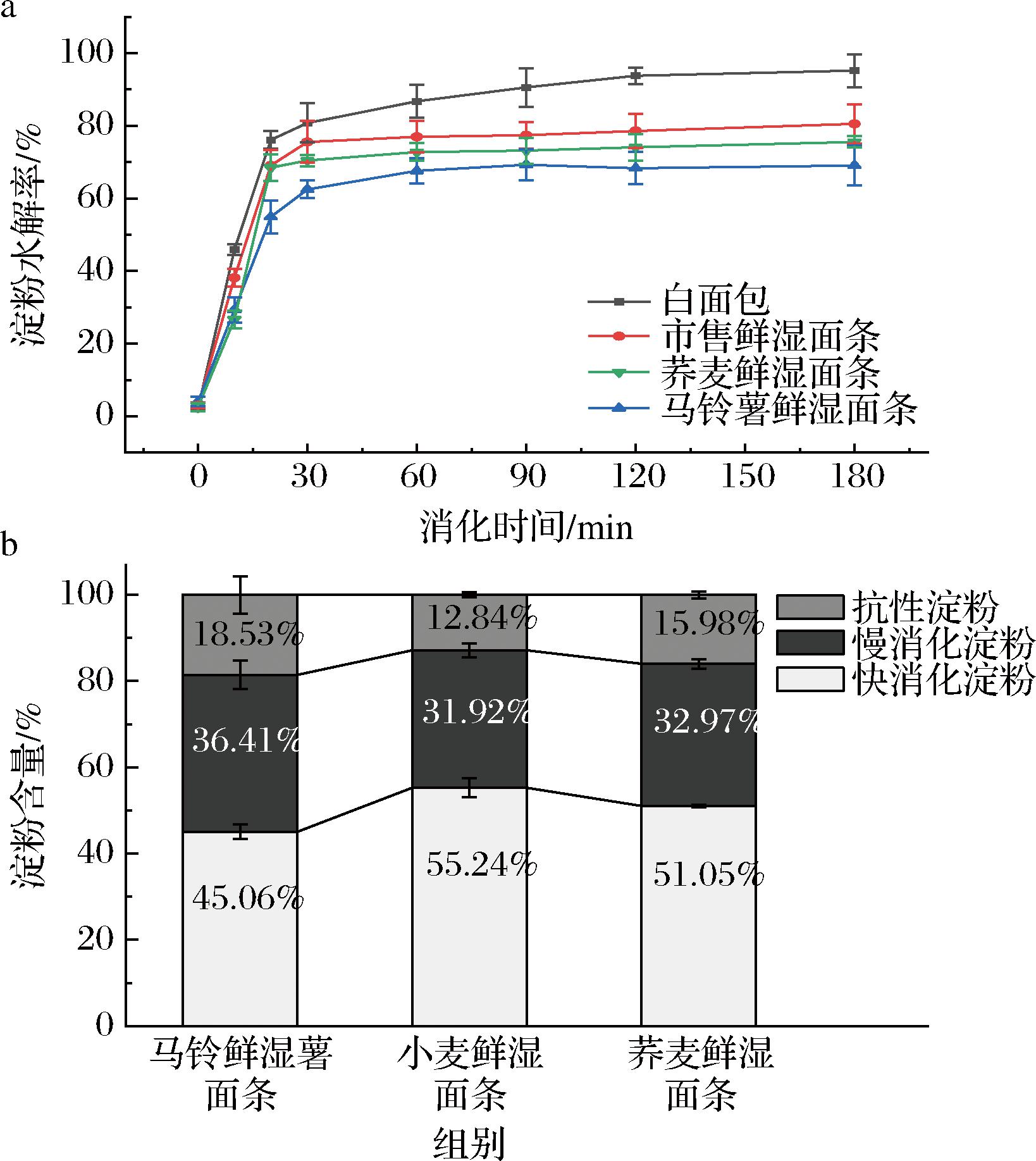 a-面条淀粉水解率;b-快消化淀粉、慢消化淀粉和抗性淀粉含量对比