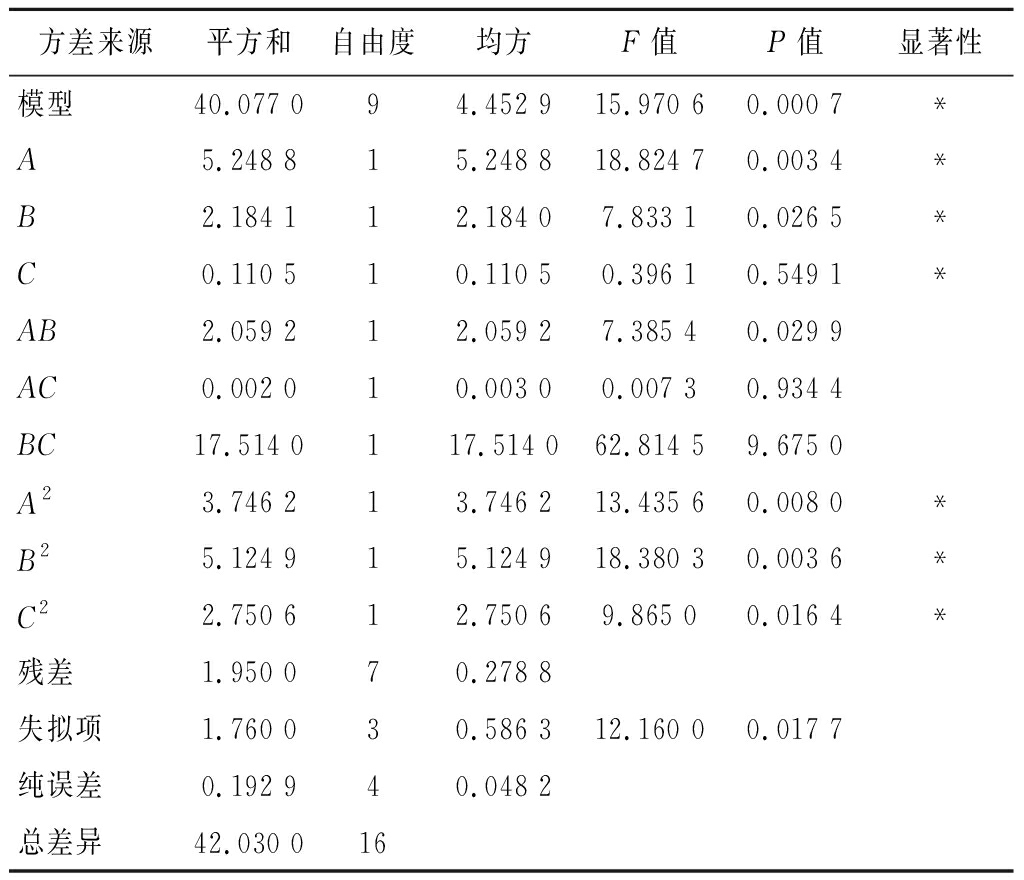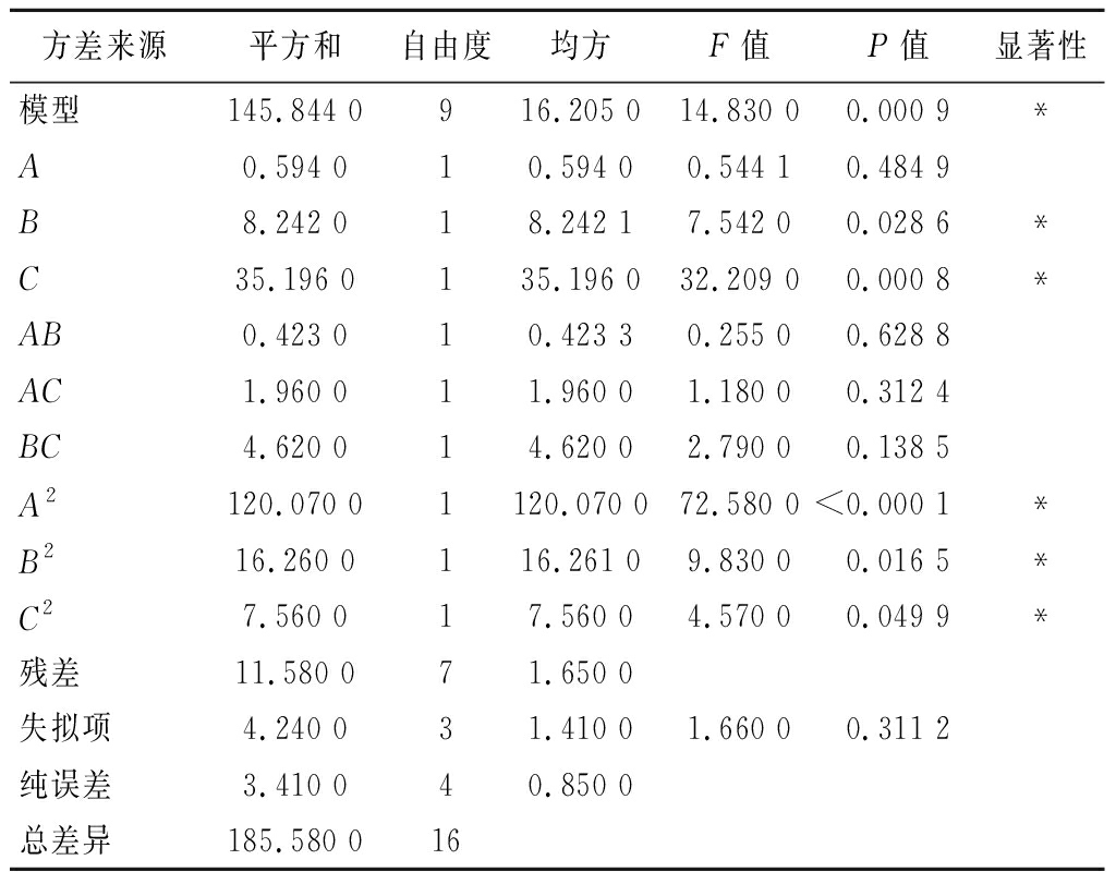 方差来源平方和自由度均方F值P值显著性模型145.844 0916.205 014.830 00.000 9*A0.594 010.594 00.544 10.484 9B8.242 018.242 17.542 00.028 6*C35.196 0135.196 032.209 00.000 8*AB0.423 010.423 30.255 00.628 8AC1.960 011.960 01.180 00.312 4BC4.620 014.620 02.790 00.138 5A2120.070 01120.070 072.580 0<0.000 1*B216.260 0116.261 09.830 00.016 5*C27.560 017.560 04.570 00.049 9*残差11.580 071.650 0失拟项4.240 031.410 01.660 00.311 2纯误差3.410 040.850 0总差异185.580 016