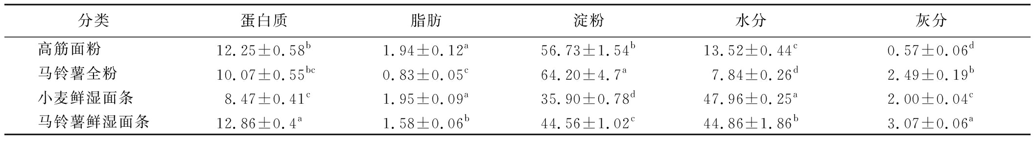 分类蛋白质脂肪淀粉水分灰分高筋面粉12.25±0.58b1.94±0.12a56.73±1.54b13.52±0.44c0.57±0.06d马铃薯全粉10.07±0.55bc0.83±0.05c64.20±4.7a7.84±0.26d2.49±0.19b小麦鲜湿面条8.47±0.41c1.95±0.09a35.90±0.78d47.96±0.25a2.00±0.04c马铃薯鲜湿面条12.86±0.4a1.58±0.06b44.56±1.02c44.86±1.86b3.07±0.06a