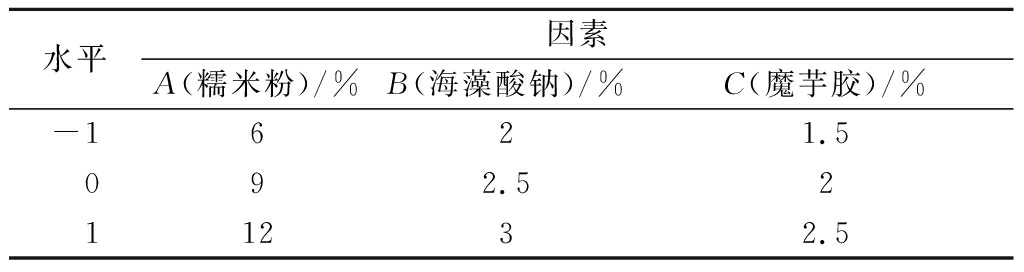 水平因素A(糯米粉)/%B(海藻酸钠)/%C(魔芋胶)/%-1621.5092.5211232.5
