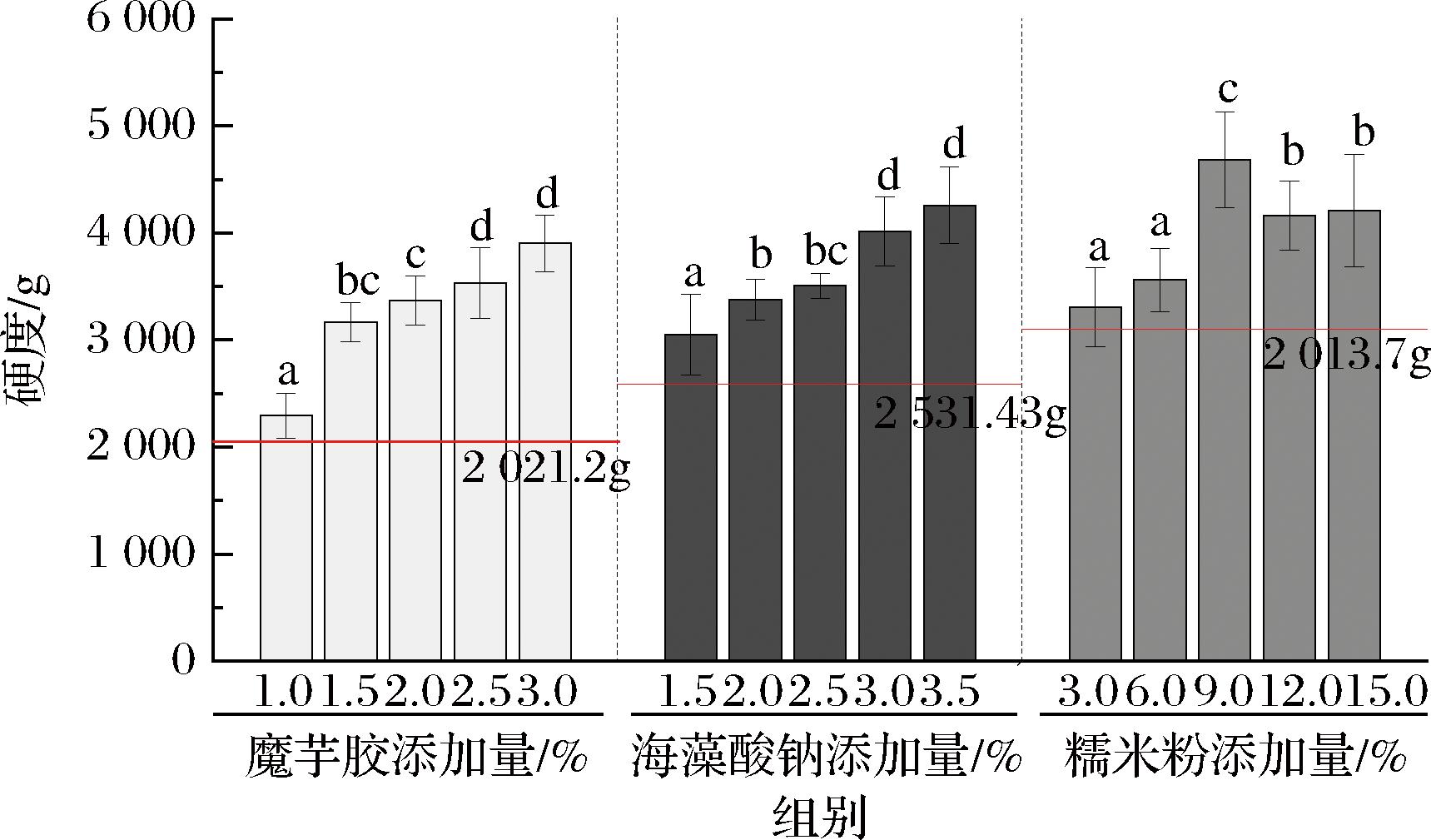 图2 外源添加对马铃薯鲜湿面条硬度的影响