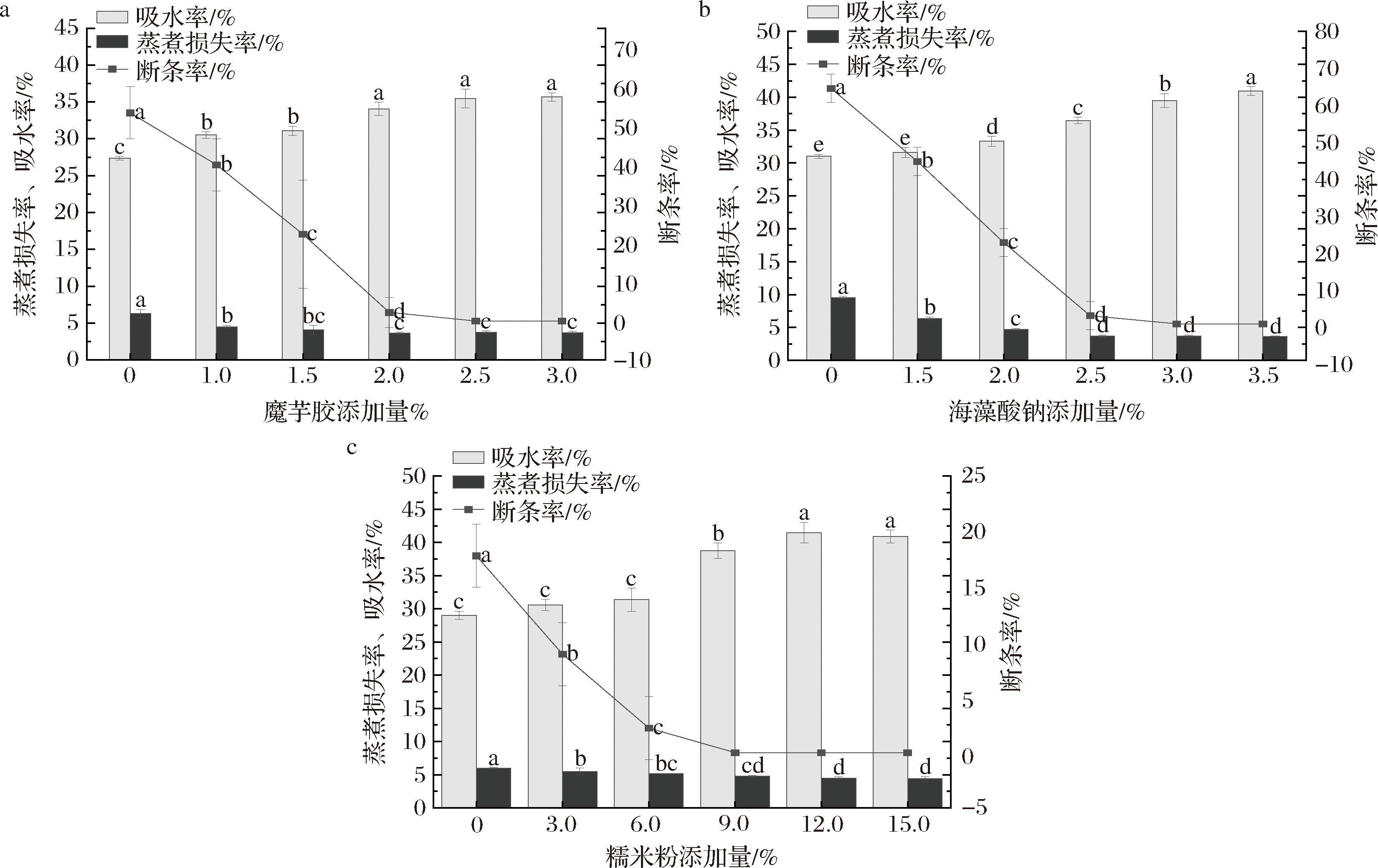 外源添加对马铃薯面条蒸煮特性的影响如图1所示。由图1可以发现,随着魔芋胶添加量增加,蒸煮损失率逐渐降低,吸水性逐渐增加。当魔芋胶添加量达到2.0%后,进一步增大魔芋胶添加量,不同组间损失率无显著性差异(P>0.05),魔芋胶添加量增加至2.5%时,生鲜面条没有发生断条现象。海藻酸钠的添加显著增大面条吸水率,降低蒸煮损失率和断条率。随着海藻酸钠添加量的增加,吸水率达到最大值40.93%,蒸煮损失率从对照组的9.56%降低至2.5%海藻酸钠添加组的3.67%,进一步增大添加量,蒸煮损失无显著变化。断条率从对照组的64.44%降低至2.5%海藻酸钠添加组的2.22%,在添加量大于2.5%时断条现象消失。魔芋胶、海藻酸钠均属于亲水胶体,具有很强的吸水性,能够与蛋白质和淀粉发生相互作用,增强面条内部蛋白网络结构的同时能够提升对水分子的结合能力,从而降低了面条的断条率和蒸煮损失率[11]。随着糯米粉添加量的增加,马铃薯鲜湿面条的吸水率逐渐増大,蒸煮损失率和断条率逐渐降低。其中吸水率从对照组的29.02%增高至12.0%添加组的41.46%,随后吸水率逐渐达到平衡。这是由于糯米淀粉中支链淀粉的存在,支链淀粉吸水性强,从而使得面条吸水率增加[12]。在糯米粉含量为9.0%蒸煮损失率为4.77%,进一步增加糯米粉添加量,蒸煮损失率无显著性差异。当糯米粉添加量为9.0%马铃薯鲜湿面条无断条现象,此时鲜湿面的内部网络结构趋于稳定。这主要是因为糯米粉的加入提升了原料粉中支链淀粉比例[13]。支链淀粉不溶于水且具有更高的稳定性、黏附性和吸水性,因为支链淀粉具有更多的分支,淀粉分子间相互作用力也更强,原料混合过程中可以与食用胶相互交联,大幅度提升了面条的稳定性,降低了面条的蒸煮损失率和断条率[14]。