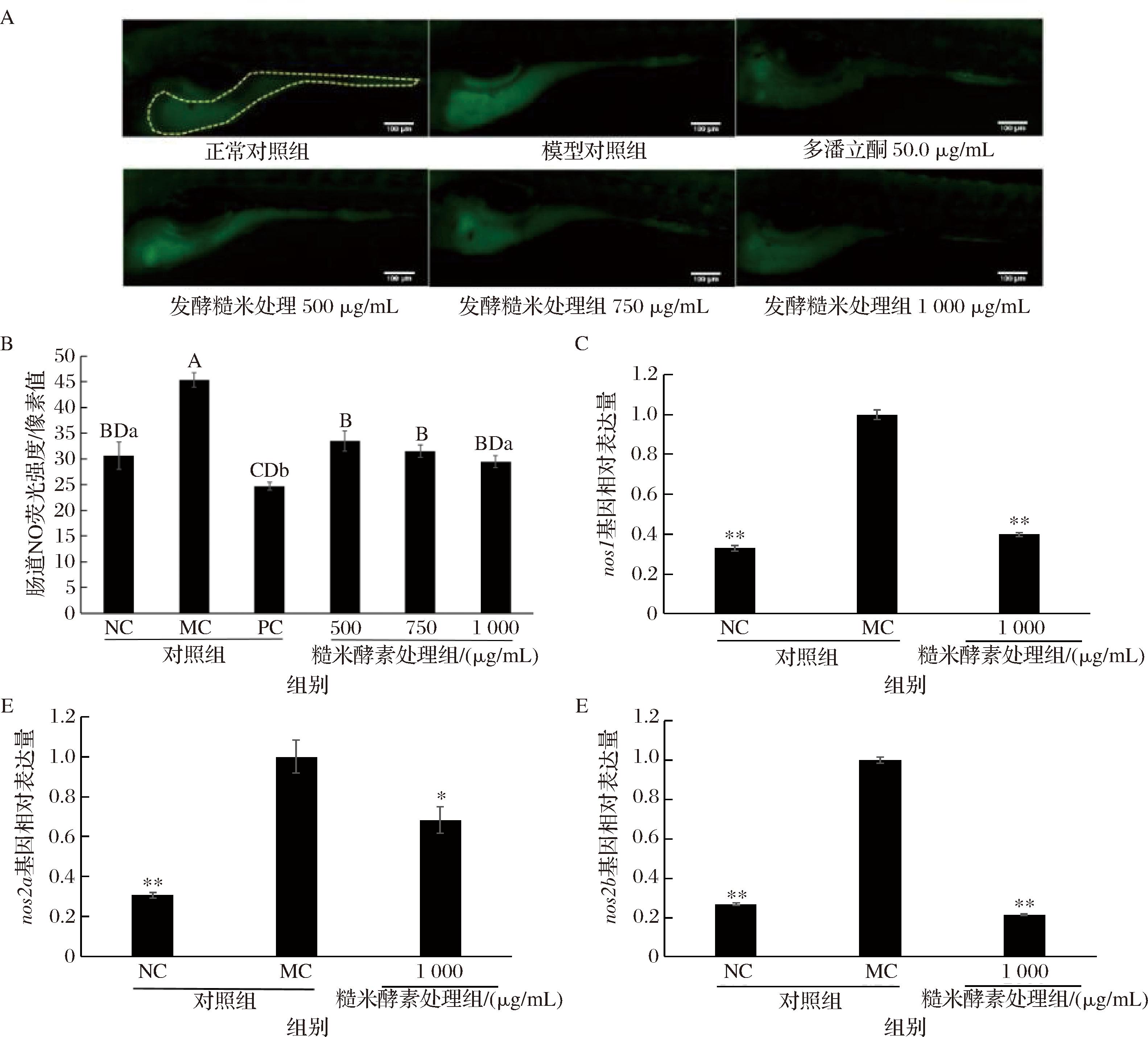 NO是影响肠动力的一种主要抑制性神经递质,在胃肠道的功能活动中发挥重要的作用[16]。NOS是NO合成过程中唯一的酶,目前斑马鱼共鉴定出nos1、nos2a和nos2b三种类型的NOS基因[17]。为探究糙米酵素干预便秘斑马鱼肠道运动的作用机制,本研究测定便秘斑马鱼模型肠道NO的荧光强度和NOS mRNA的表达水平。图3表明,便秘斑马鱼模型肠道NO的荧光强度与肠道荧光强度表现出相同的趋势。随着糙米酵素的处理质量浓度增加,斑马鱼肠道NO的荧光强度减弱(图3-A),相比于模型对照组,500、750、1 000 μg/mL糙米酵素处理组NO的荧光强度分别显著降低了26.1%、30.6%和35.1%(P<0.01),且与正常对照组的差异均不显著(P>0.05),同样表明糙米酵素相较于多潘立酮能够更温和地促进便秘斑马鱼模型的肠道运动(图3-B)。同时,1 000 μg/mL糙米酵素处理时,便秘斑马鱼模型的nos1和nos2b基因的相对表达量极显著降低(P<0.01,图3-C和图3-E),nos2a基因的相对表达量显著降低(P<0.05,图3-D),表明糙米酵素处理可下调斑马鱼NOS基因的表达,提高便秘斑马鱼NO的清除率,从而促进斑马鱼的肠道运动。